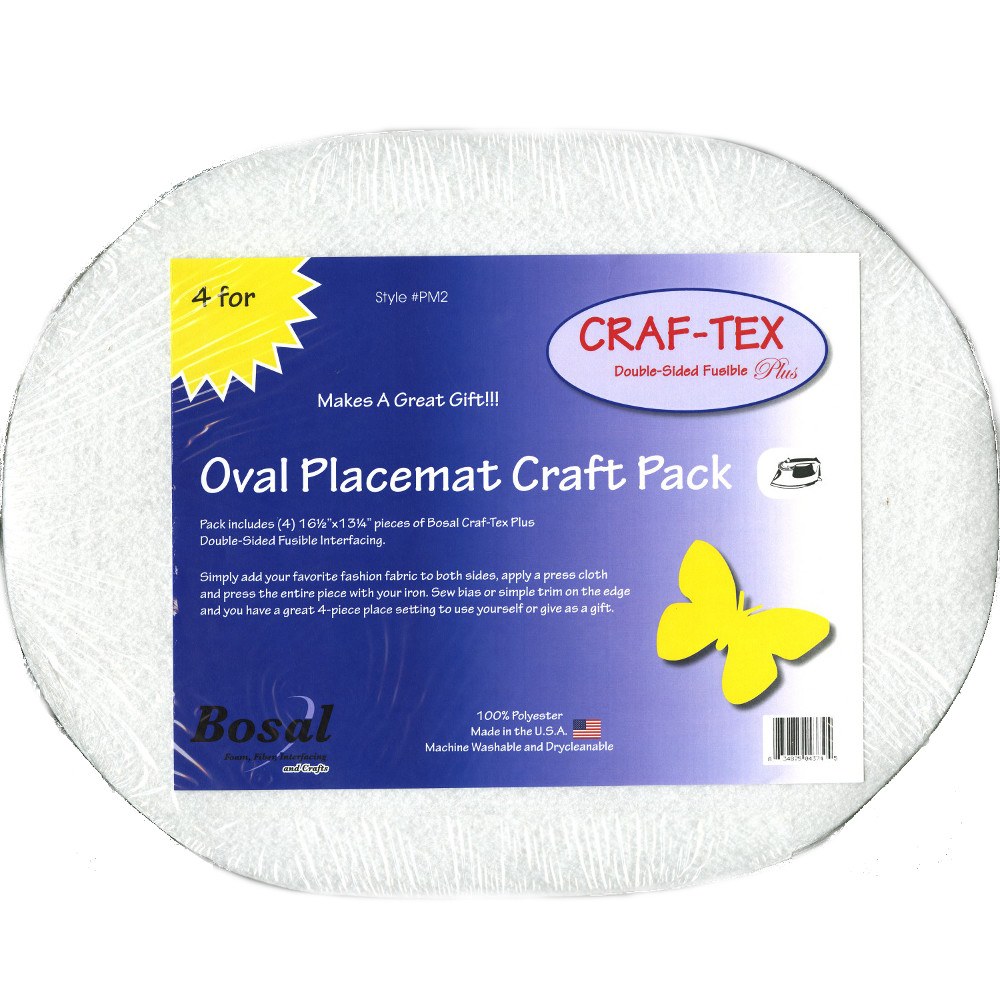 Bosal Oval Placemat Craft Pack makes it easy to make four placemats. Choose your fabric, and iron it onto each side. Add a binding and set the table! Bosal Oval Placemat Craft Pack makes a perfect gift. Placemats measure 16in by 12-1/2. Made in the USA.