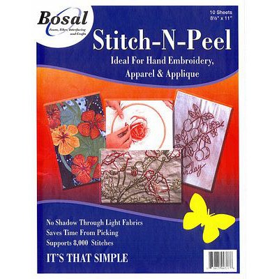 Bosal Stitch-N-Peel Hand Embroidery Stabilizer is a lightweight stabilizer ideal for hand embroidery, applique, and apparel. Bosal Stitch-N-Peel Hand Embroidery Stabilizer is 70% rayon and 30% polyester. The sticky back helps fabric stay in place while sewing. Easily remove Bosal Stitch-N-Peel Hand Embroidery Stabilizer after sewing. Each package contains 10 sheets of 8-1/2in by 11in stabilizer.