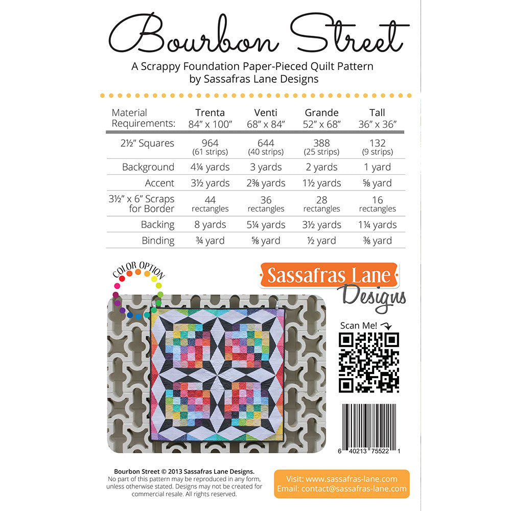 The Bourbon Street Quilt Pattern by Sassafras Lane Designs is the perfect pattern for those who love vintage pieces turned modern. This unique design is fabric roll, fabric strip, and scrap basket friendly, along with basic patchwork and paper piecing. This intermediate pattern from Sassafras Lane Designs can finish to four different sizes; 36" by 36", 52" by 68", 68" by 84", or 84" by 100". The Bourbon Street Quilt Pattern also comes with instructions and a list of suggested materials.