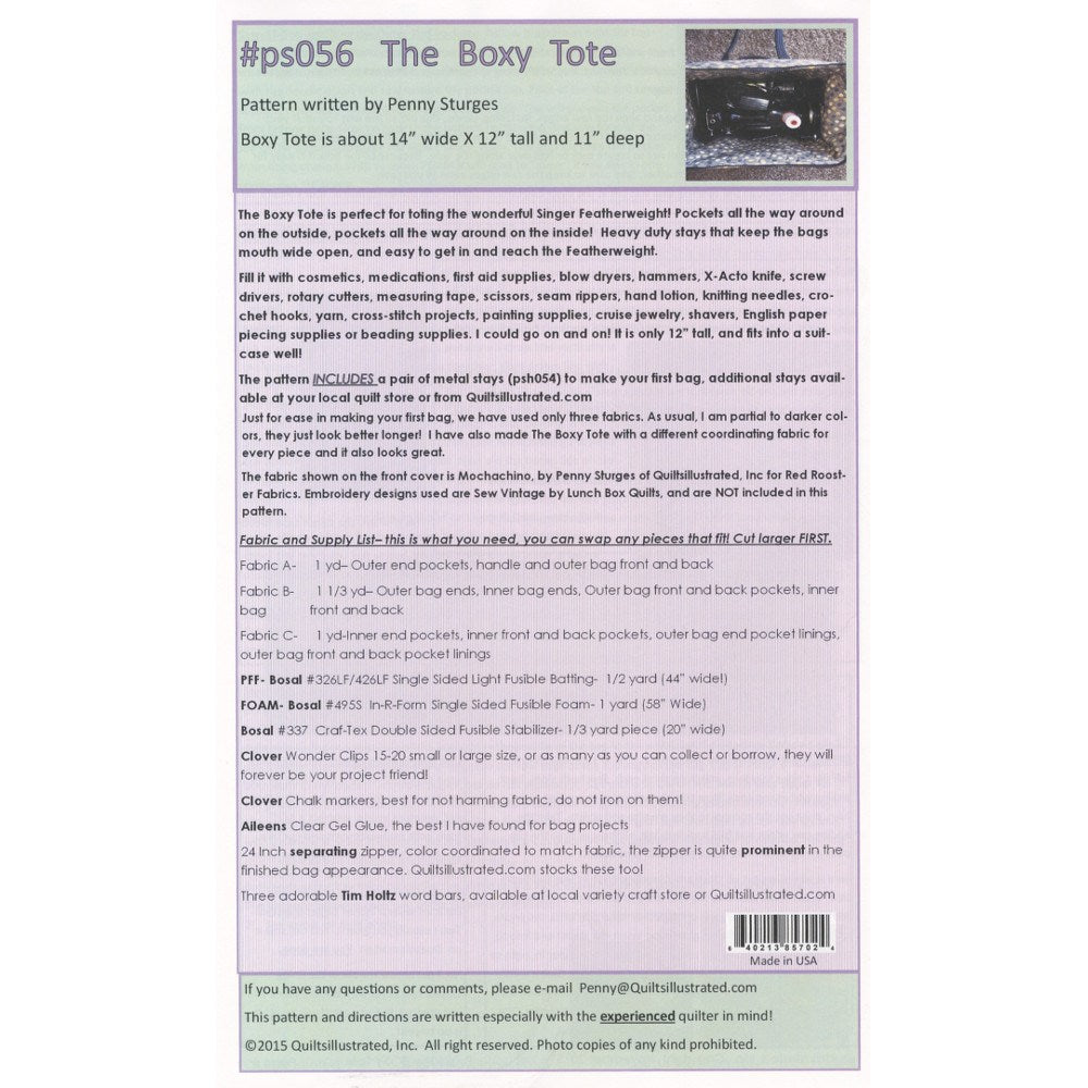 Use the Boxy Tote Pattern to create a bag that was initially intended to hold a Singer Featherweight Sewing Machine. Besides using the Boxy Tote Pattern as a sewing machine case, it can be used to store your knitting projects, sewing supplies, or it can be turned into a diaper bag. The Boxy Tote Pattern has a rigid metal frame that will hold open the mouth of the bag, making it easier to get items in and out. Included with this pattern are two metal stays, recommended materials, and detailed instructions.