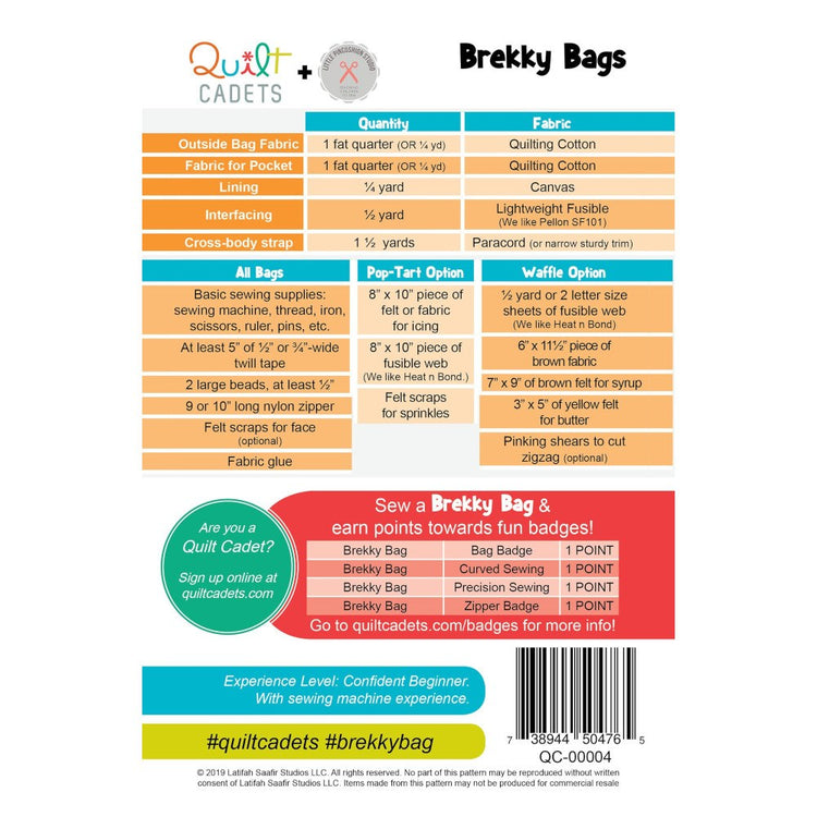 Quilt Cadets Patterns are specially designed for children who sew! These fun patterns are ideal for confident beginners to intermediate kid sewists. This pattern from the series is called Brekky Bags.