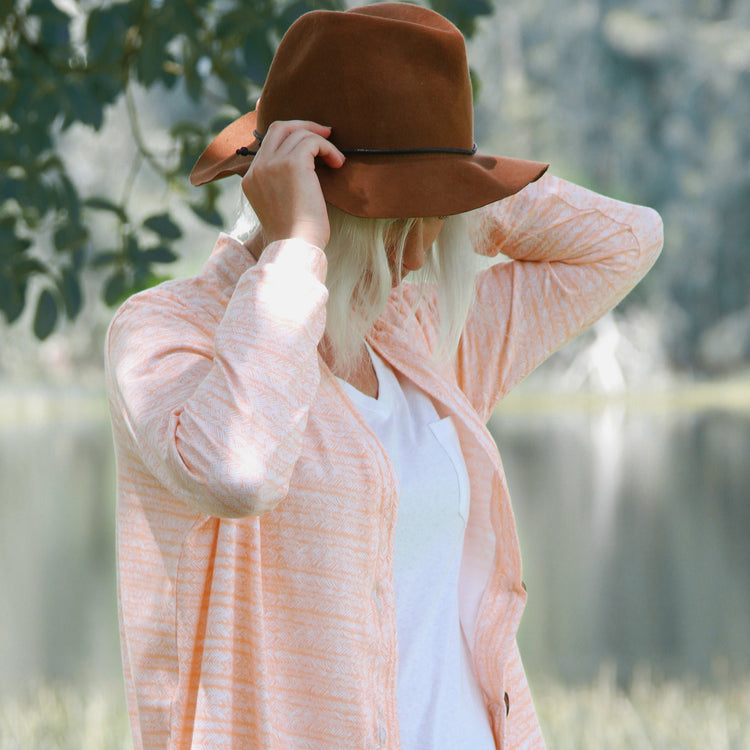 Softly radiant and gently textured, Bristling Balmy Knit brings a sense of simple joy to your sewing with its warm, sun-washed peach hue and delicate white feathered motif. Designed as part of Bonnie Christine's Gathered collection, this fabric celebrates the quiet beauty found in everyday moments—like wandering through a garden, collecting wildflowers, or sharing time with loved ones. The subtle, hand-drawn chevron-like pattern mimics nature's quiet rhythms, adding a lovely organic movement that feels both timeless and serene. Measuring approximately 58" wide and made from a supple blend of 95% cotton and 5% spandex, this knit is wonderfully soft, breathable, and stretchy in all the right ways.