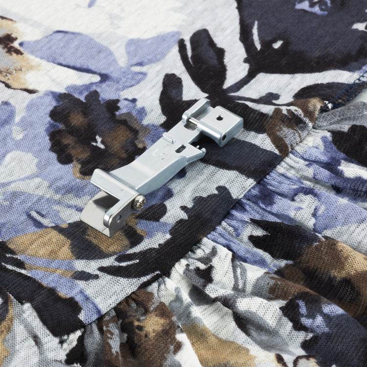 The Gathering Foot can be used for lightly gathering fabric as well as attaching the gathered edge to a flat (ungathered) fabric, at the same time quickly and easily. The gathering foot will allow the sewer to gently ease or slightly gather fabric for various garment and home decorating applications.