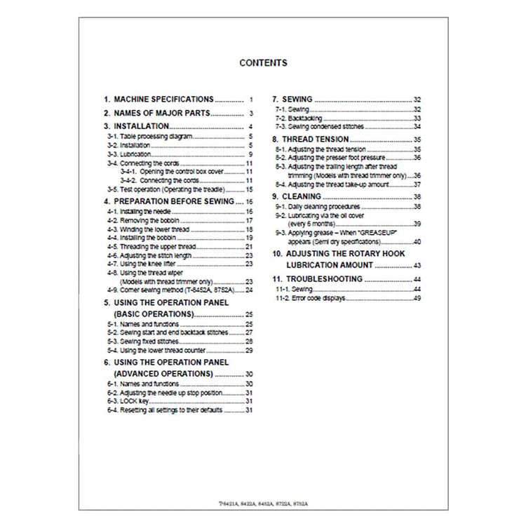 Brother T-8452A Sewing Machine Instruction Manual (Model 8421A/8422A/8452A/8722A/8752A) - 57 Pages. Lost your sewing machine's manual? We've got you covered! This instruction manual is the ultimate guide to unlock the full potential of your Brother T-8452A. No more confusion or frustration—just clear, concise instructions right at your fingertips. What's inside? Everything you need to know from setting up to mastering your sewing machine and all its features.