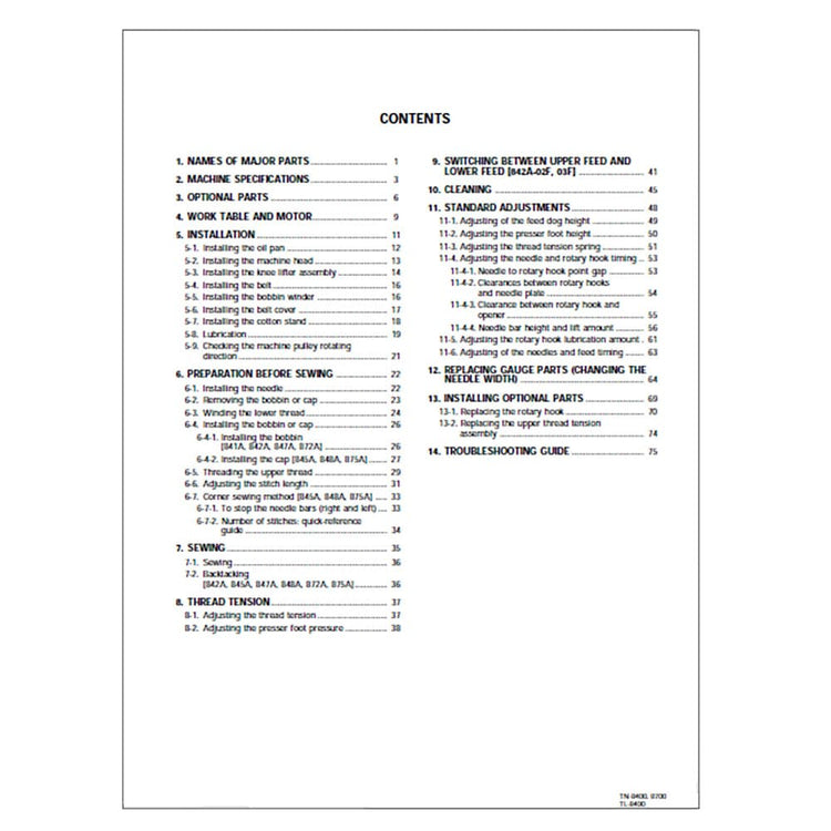 Brother TN-841A Sewing Machine Instruction Manual (Model 841A/842A/845A/847A/848A/872A/875A) - 98 Pages. Lost your sewing machine's manual? We've got you covered! This instruction manual is the ultimate guide to unlock the full potential of your Brother TN-841A. No more confusion or frustration—just clear, concise instructions right at your fingertips. What's inside? Everything you need to know from setting up to mastering your sewing machine and all its features.