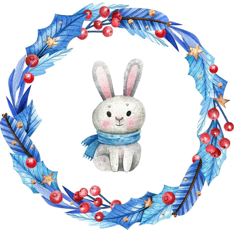 The Blue Bunny in a Wreath Fabric Panel is a part of the Watercolor Christmas Stories Fabric Collection printed by Sew Creative Fabrics. This panel is digitally printed on 100% cotton. The fabric panel is available in 6 different sizes: