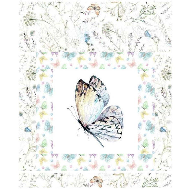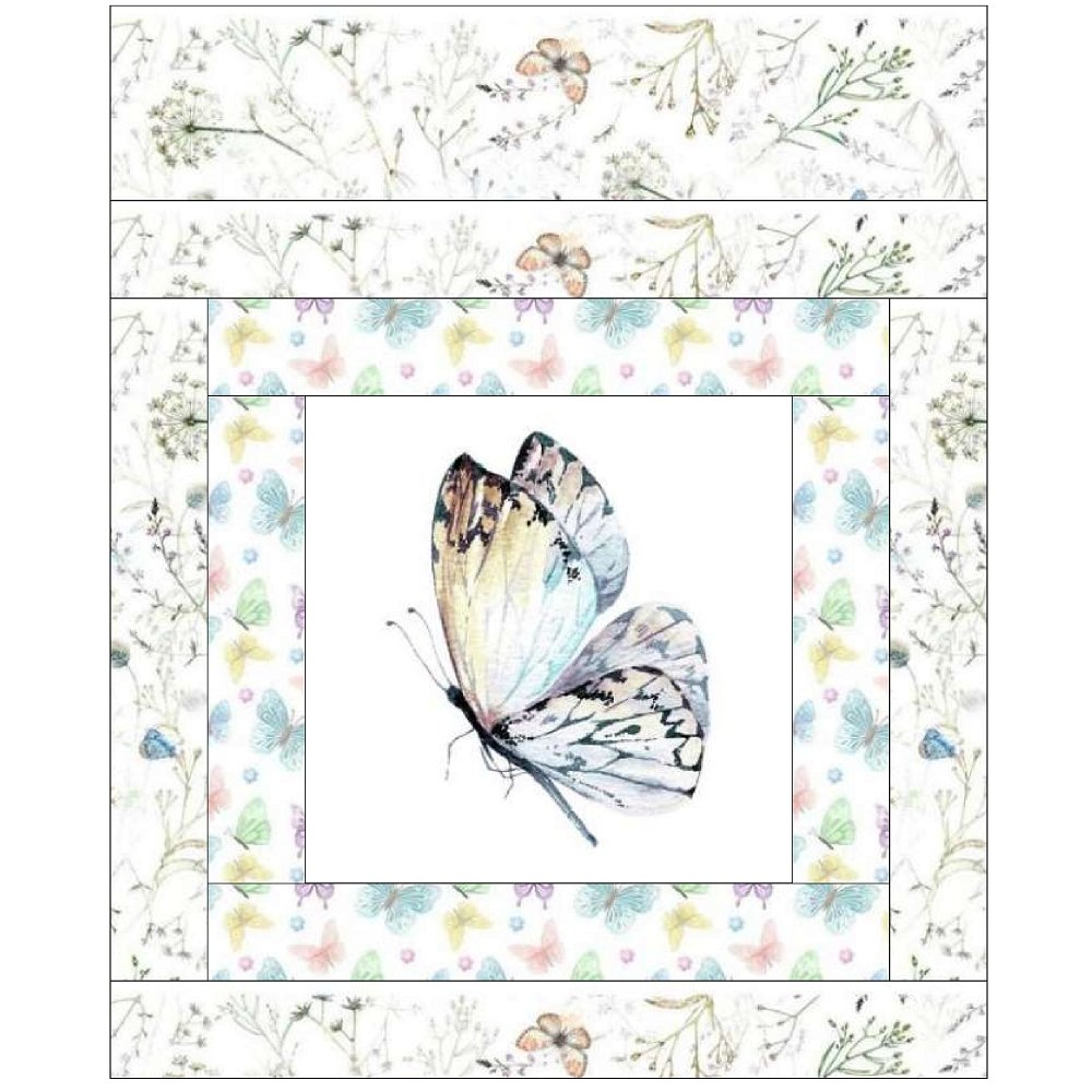The Butterflies Fly Free Mini Wall Hanging includes the instructions, one fat quarter and one layer cake. It has two borders around a 4 1/2" panel with a flap for folding a rod pocket for the dowel rod. Batting/interfacing/lining, dowel rod, and ribbon are sold separately. The finished size of this wall hanging is 9" x 9". Level - Beginner. Fast project to make as a gift for someone, or for your own enjoyment.