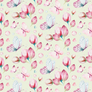 The Light Green Butterflies & Tulips Fabric is part of the Fairytale Fantasy Fabric Collection printed by Sewing Parts Online. Digitally Printed on 100% cotton.