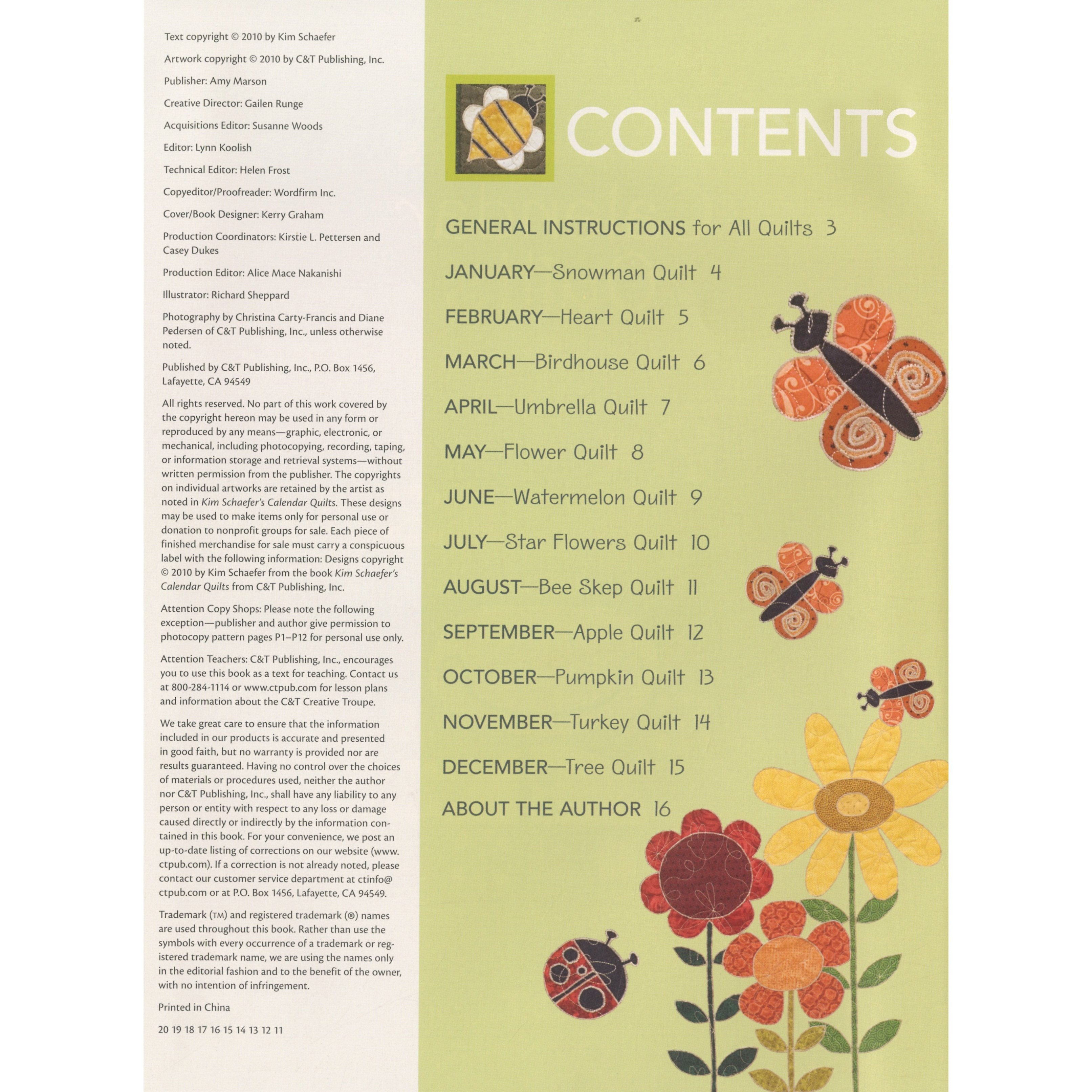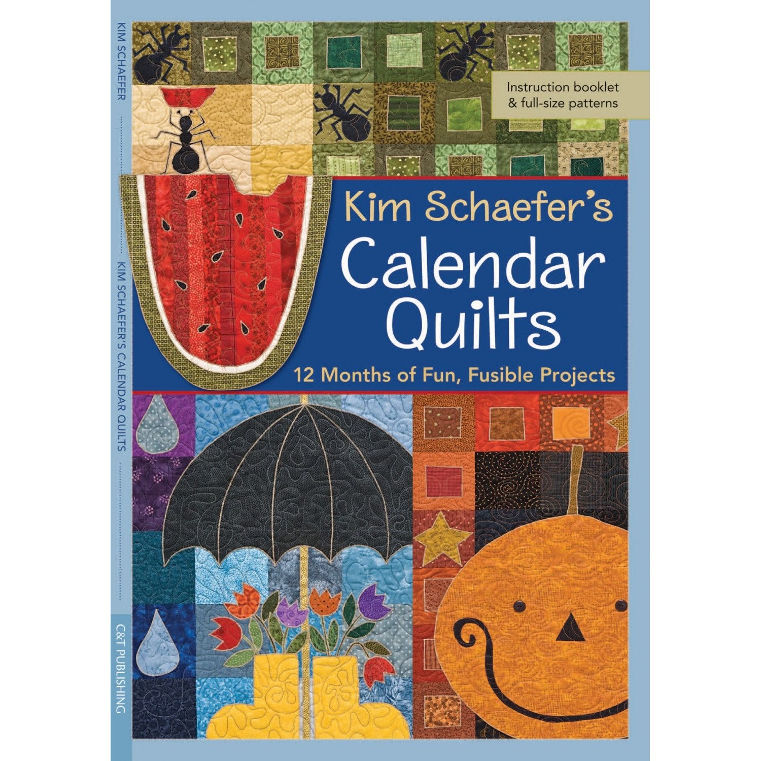 With Kim Schaefer's Calendar Quilts you can start a family tradition you can enjoy year round with these fun wall quilts! Hang a new one each month! Smile with cheer at your snowman in the winter, laugh at the ants crawling through your summer picnic, and get that apple ready for your teachers in the fall! Includes 12 seasonal wall quilt full size patterns. Published by C&T Publishing. 16 Pages.