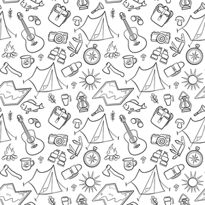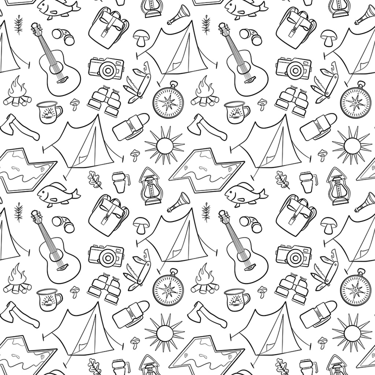 The Camping Supplies Fabric is part of the Black & White Fabric Collection printed by Sewing Parts Online. Digitally Printed on 100% cotton.