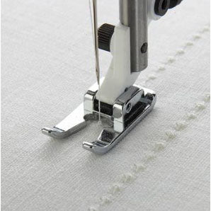 The Candlewicking Foot has a deep tunnel on the underside to feed over a built up stitching. Program a "French Knot" stitch on computer Husqvarna Viking sewing machines to sew the heirloom candlewicking technique.