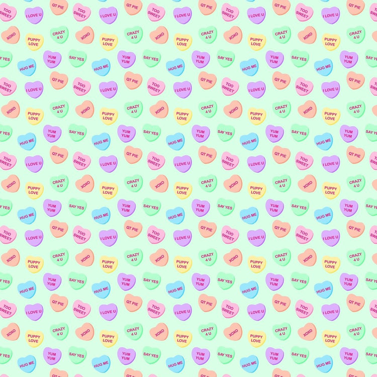 The Candy Hearts Fabric is part of the Be Mine Fabric Collection printed by Sew Creative Fabrics. Digitally Printed on 100% cotton.