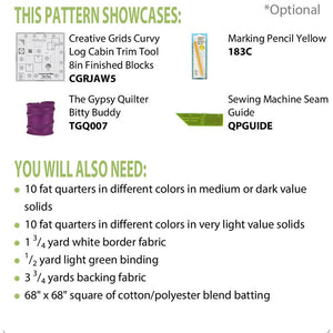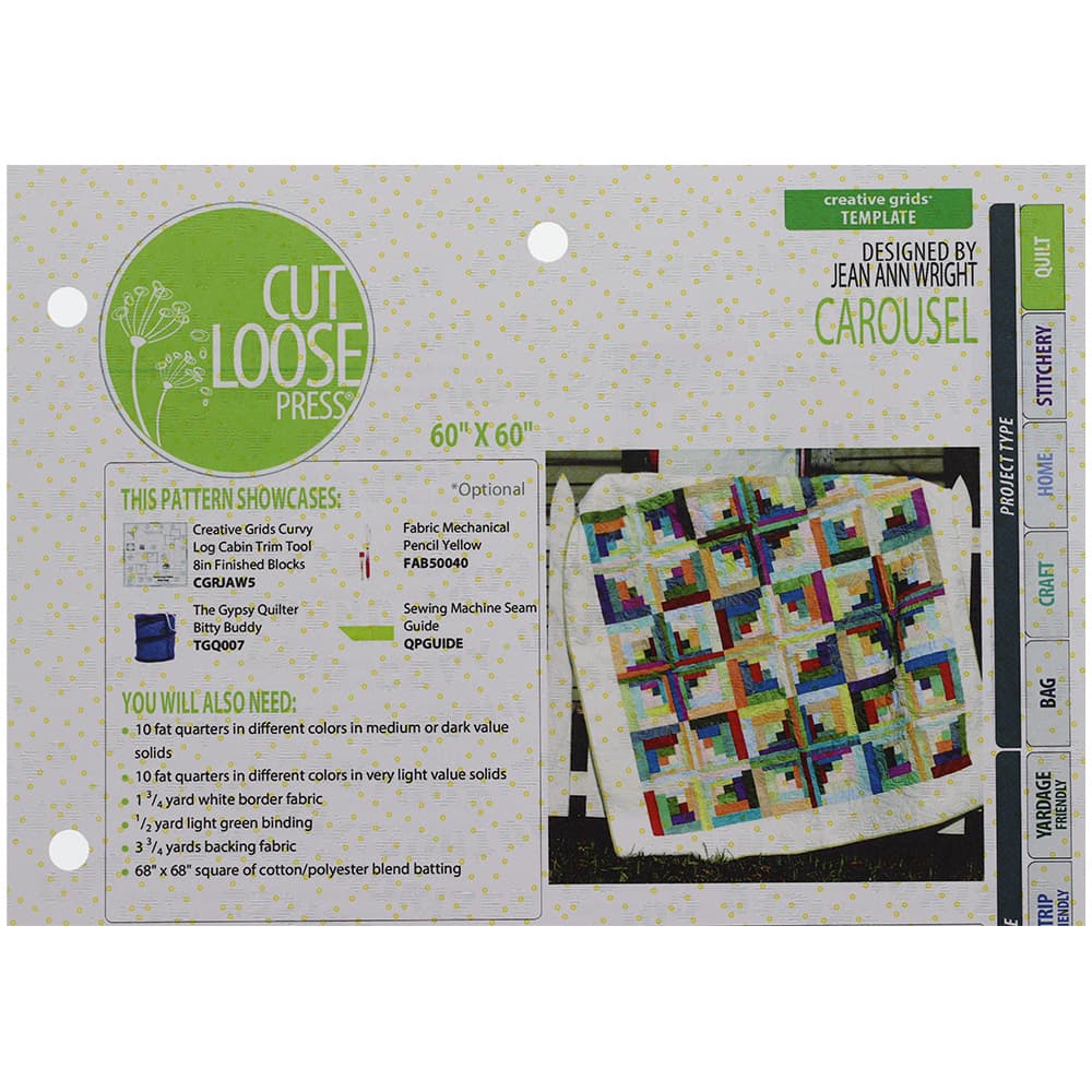To make the Carousel Quilt Pattern, Cut Loose Press recommends the Creative Grids 8" Curvy Log Cabin Trim Tool (sold separately) to help create your blocks. Designed by Jean Ann Wright, the Carousel Quilt Pattern finishes to 60" squared. Also, included with the design are directions on how to downsize the pattern to 44" by 44" with the 6" Curvy Log Cabin Trim Tool (sold separately). Use fat quarters to save time and money when sewing this intricate quilt. A list of fabric requirements and instructions are included with the Carousel Quilt Pattern.