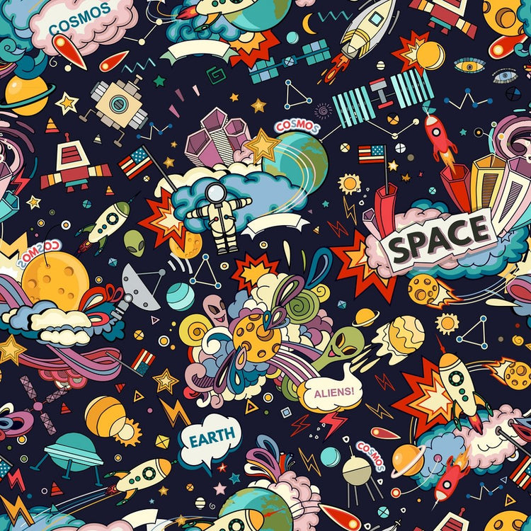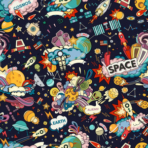 The Cartoon Space Fabric is part of the Kid's Playtime Fabric Collection printed by Sew Creative Fabrics. This fabric features space aliens, rockets, astronauts, stars, planets, and more. Digitally Printed on 100% cotton and measures 44-45" wide. Sew Creative Fabrics are only available through Sewing Parts Online, not sold in stores or anywhere else online. * Proudly Manufactured in Dickson, Tennessee USA! *