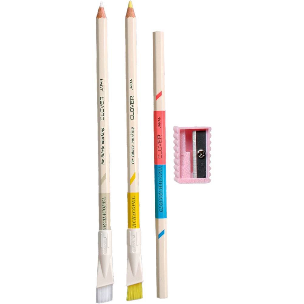 The Clover Chacopel Fine Pencil Set is designed for marking fine lines on fabrics. This set includes three pencils (white, yellow, and pink/blue), two pencil caps with brushes, and a sharpener.