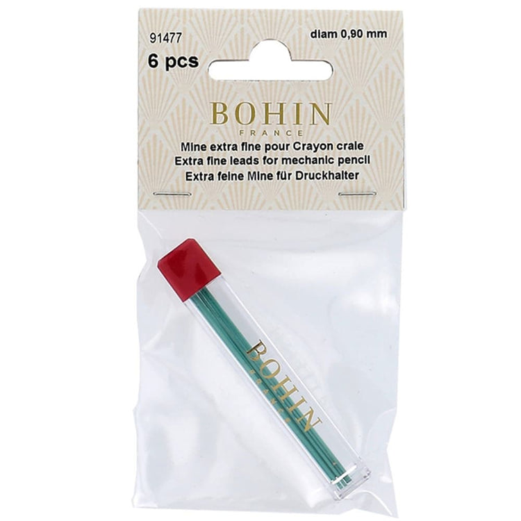 These chalk lead refills are designed to work with Bohin Mechanical Chalk Pencil #91473. Each pack contains six, 0.9mm green leads. Mechanical Chalk Pencil sold separately.