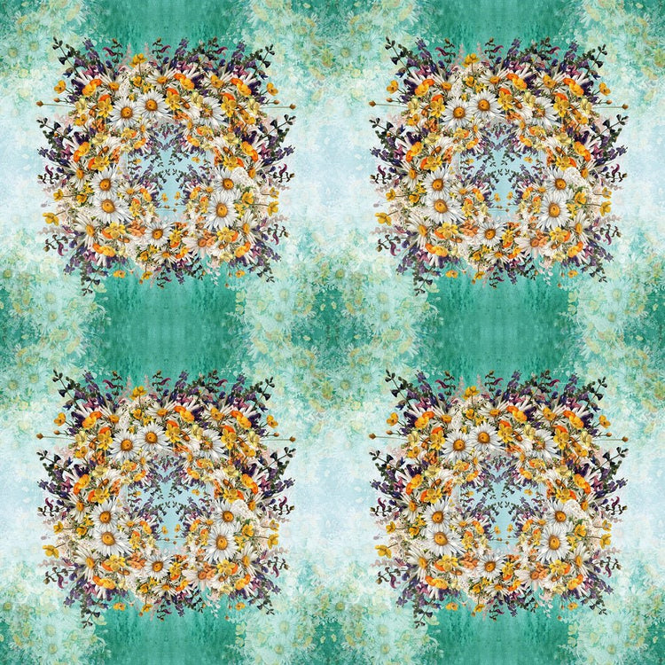 Chamomile Flowers Mirrored Bouquets Fabric - Green