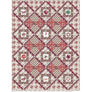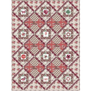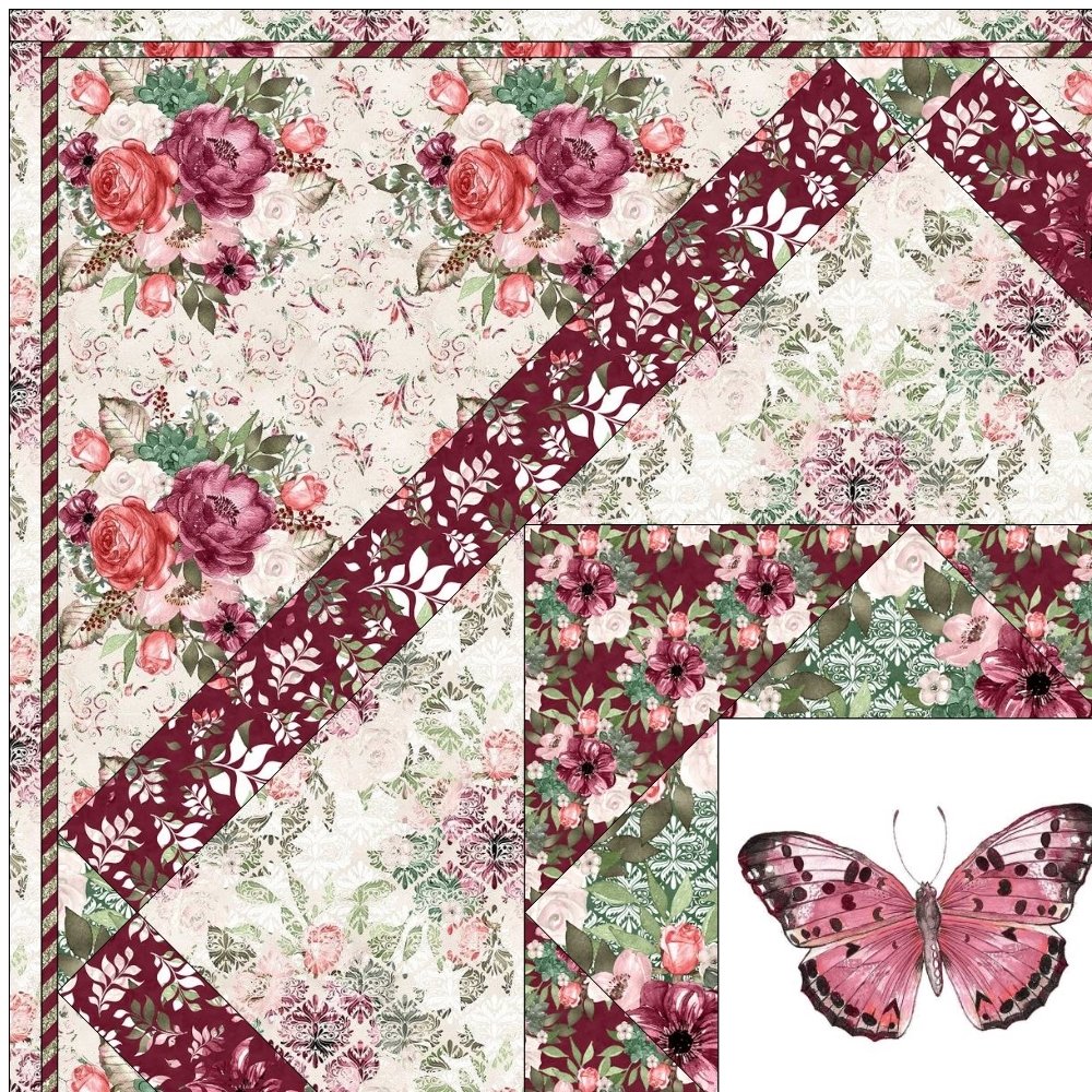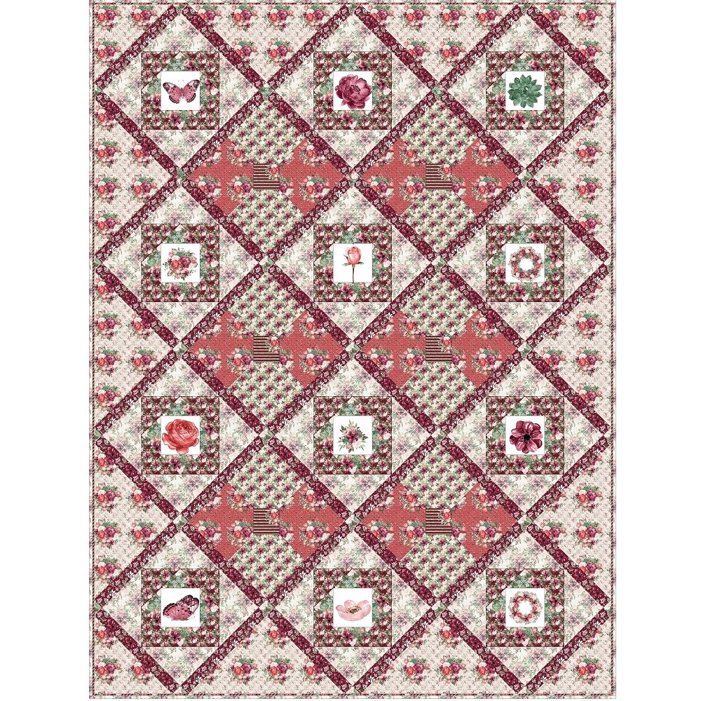 The Champagne & Burgundy Florals Quilt Kit includes everything you need to make the quilt - the instructions, 12 panels, and a total of 19 3/4 yards of fabric for sashing, flange binding, and backing. The quilt kit features an assortment of 12 different Champagne and Burgundy Floral Collection Panels with coordinating fabrics from the same line. It is set in a diagonal grid pattern on point using the Twelve Triangle Block, with sashing and cornerstones. Alternate Bow Tie block adds additional contrast. Batting is sold separately. The finished size of this quilt is 81" x 108".