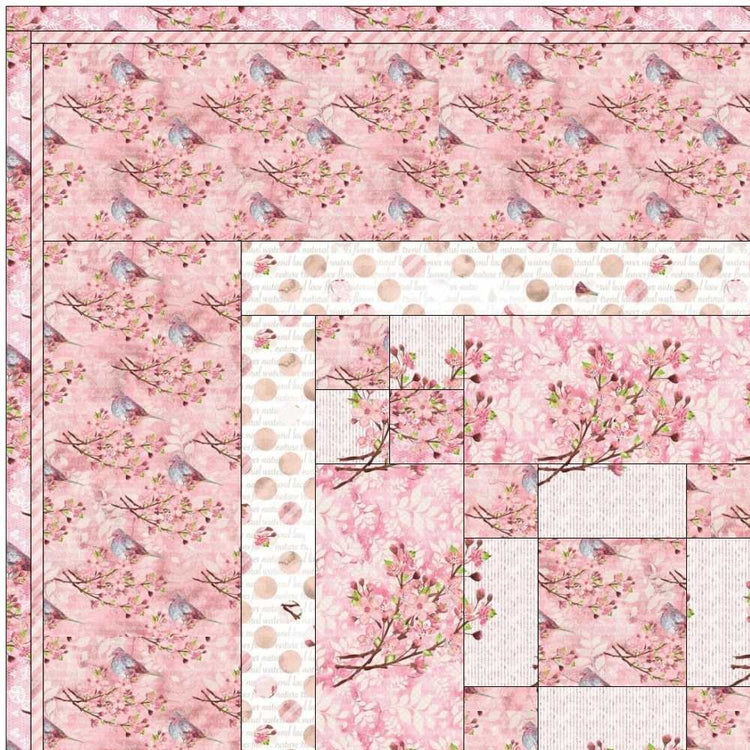 The Cherry Blossom Quilt Kit includes everything you need to make the quilt - the instructions, 2 fabric panels, and a total of 14 yards of fabric for sashing, backing, and squares. An 8-Grid Chain block made with an assortment of fabrics from the Cherry Blossom Collection. The quilt consists of 24 blocks and 2 panels. Batting is sold separately. The finished size of this quilt is 72 1/2" x 84 1/2".
