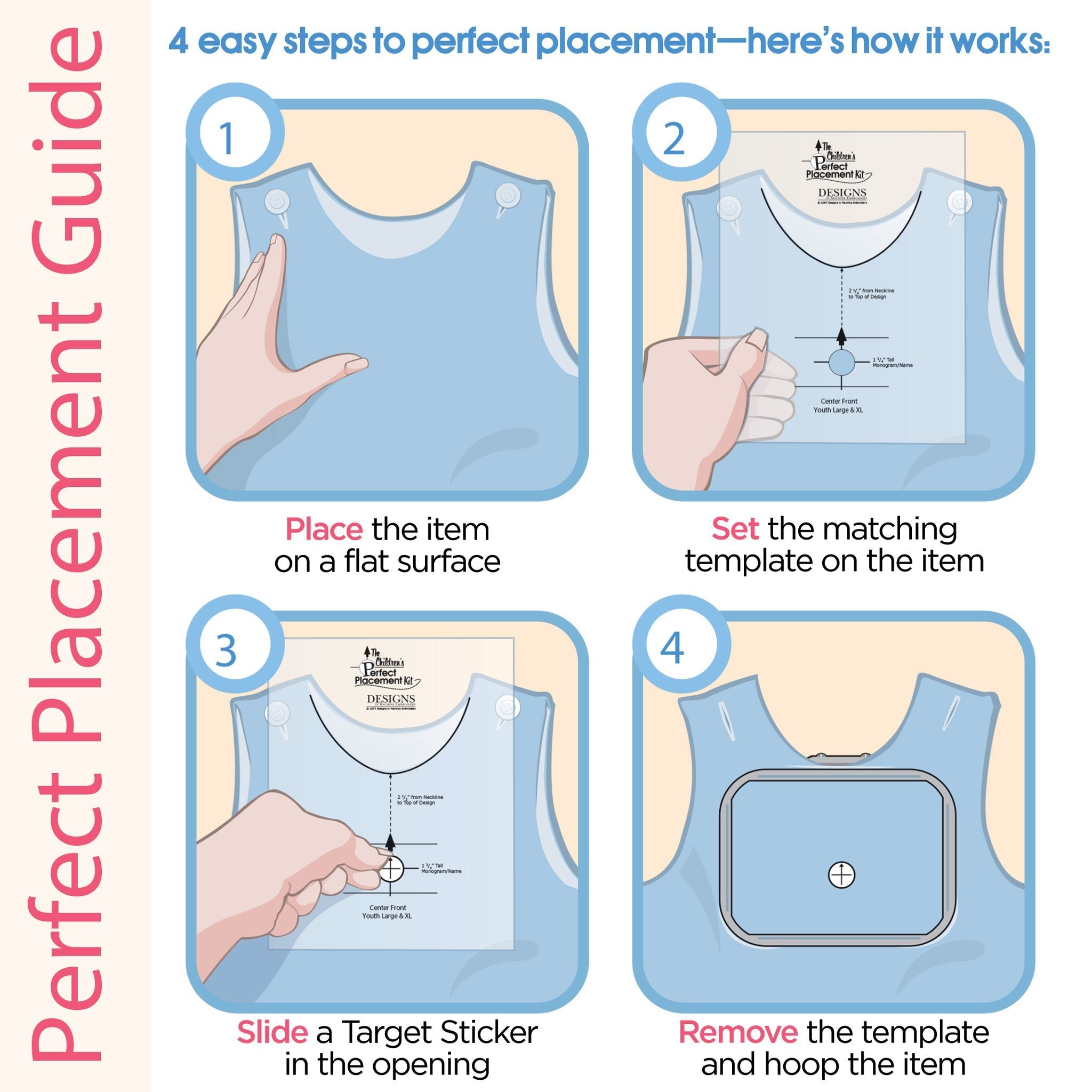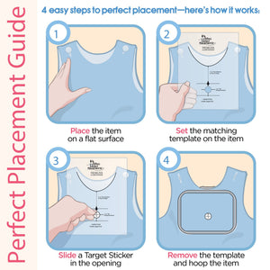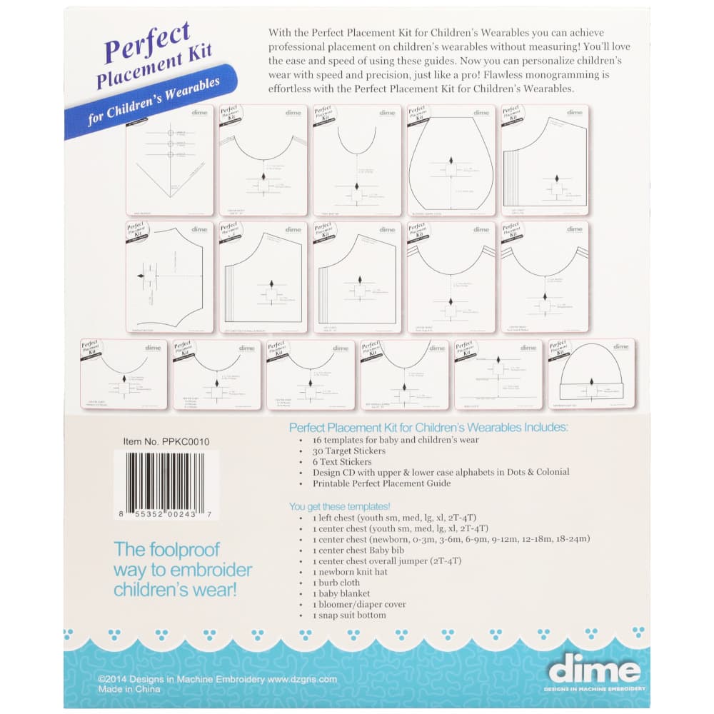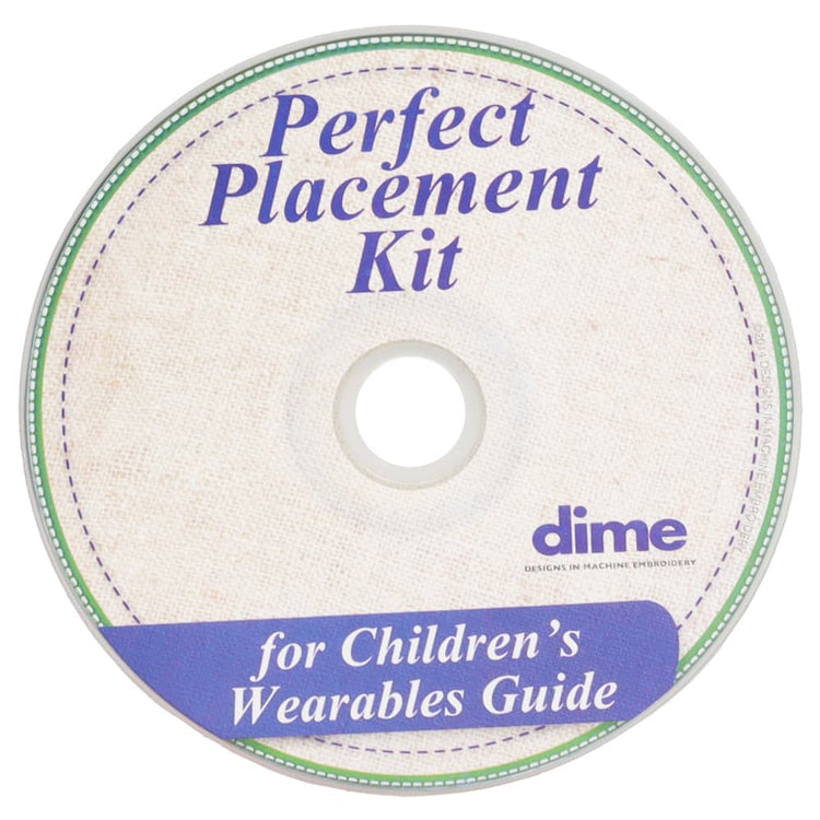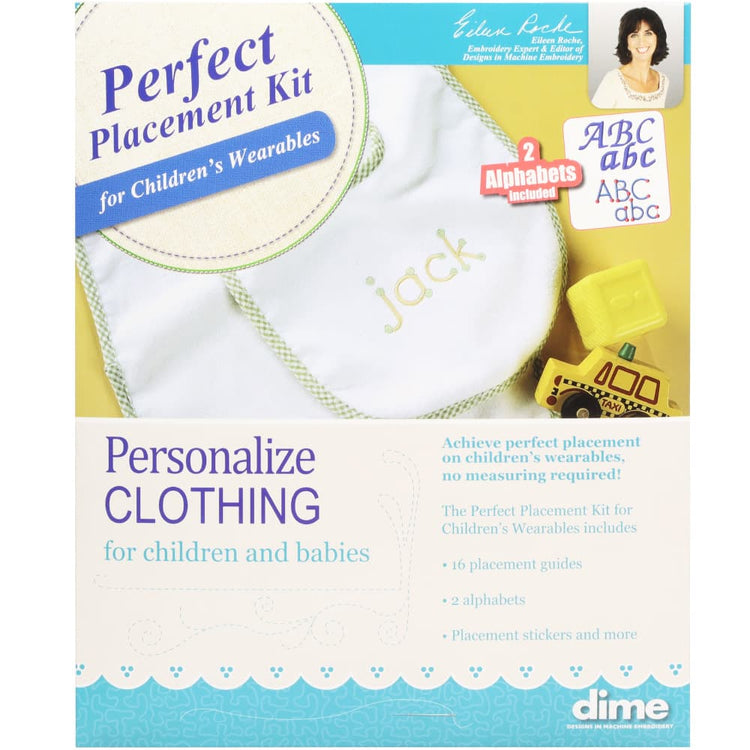 For easy, hassle-free design placement on children's clothing, use the Children's Perfect Placement Kit from DIME. The kit includes an embroidery CD with two fonts, an instructional guide, 36 target stickers, and 16 plastic templates. Perfectly position designs on clothing for babies and children from infant sizes to youth XL, including onesies, jumpers, polo shirts, bibs, hats, diaper covers, blankets, and burp cloths!