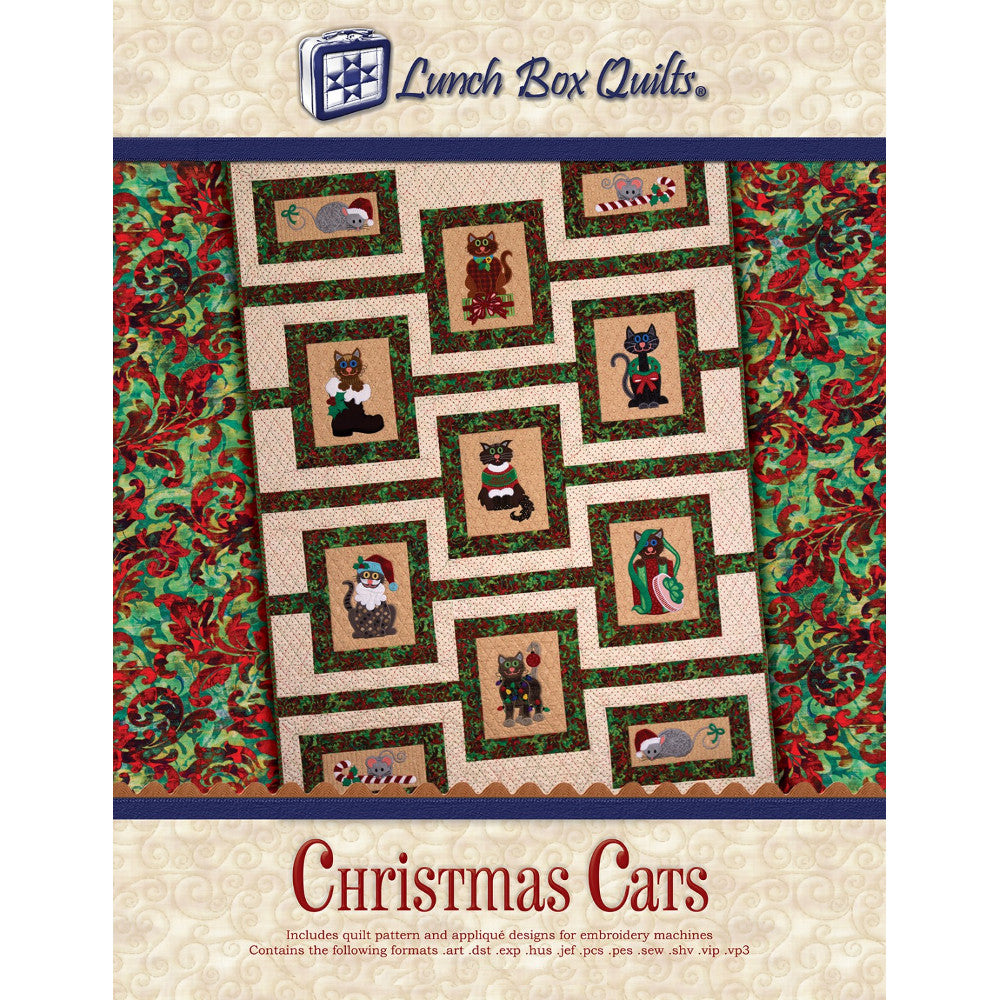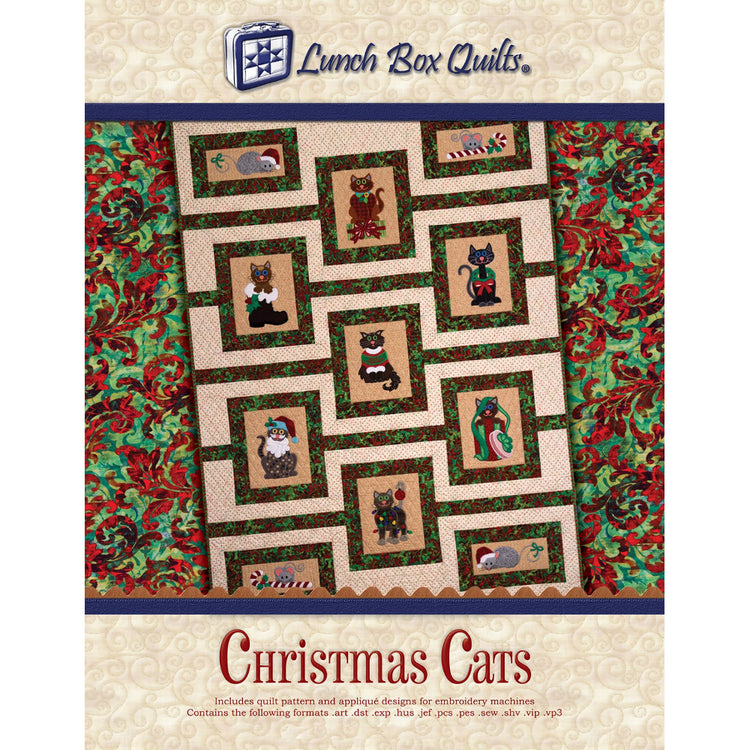 If you have cats then you know they love Christmas, and they always seem to get into mischief with the decorations. Use the Christmas Cats Quilt Pattern CD to create a quirky cat-centric quilt. The pattern can be used to make a 48" by 66" quilt or an 18" by 44" wall hanging. Design formats include: .art, .dst, .exp, .hus, .jef, .pcs, .pes, .sew, .shv, .vip, and .vp3.