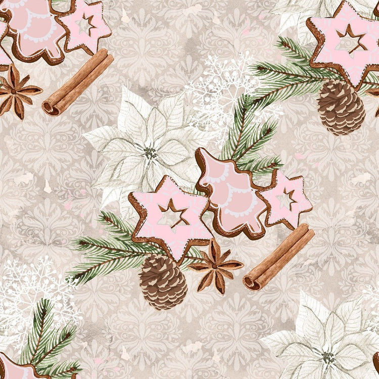 Christmas Elements on Snowflakes Fabric - Tan Details