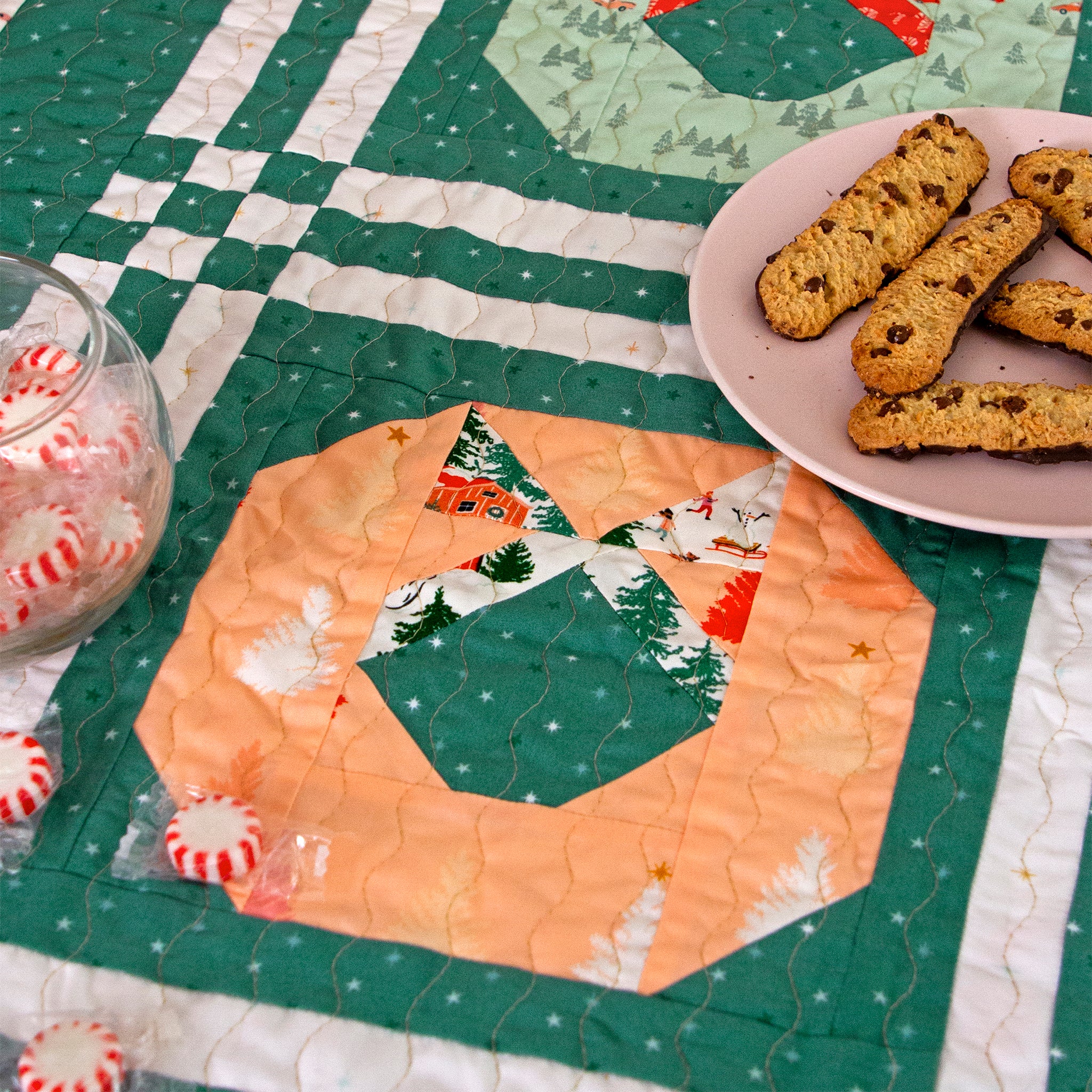 With charming prints of vintage ornaments, pine trees, wrapped presents, and cozy cabin plaids, Christmas in the Cabin brings a storybook warmth to every stitch.