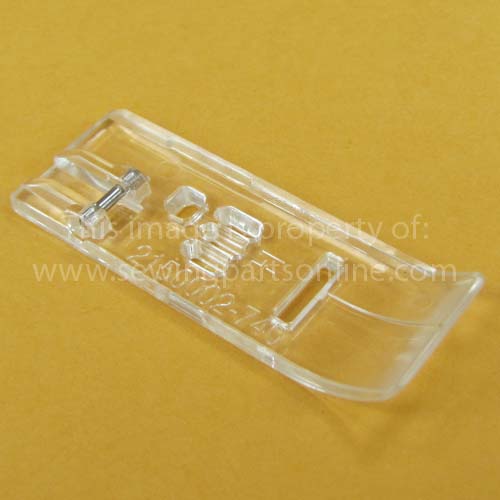 The clear coverstitch foot produces professional hems on knit garments. Used with a twin or triple needle, the stitch appears as parallel lines on the front and looks sergered on the back.