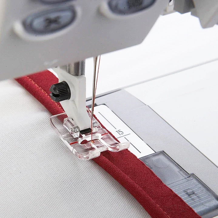 Add a tailored finish to seams and edges by inserting packaged piping. For custom piping, cover cord with your choice of fabric. The clear view of this foot allows you to see the piping placement and precisely where you are stitching. It also lets you see the first row of stitching, so you can easily adjust your needle position to sew neatly next to the original row. Use a straight stitch with a length of 2.5 for best results.