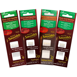 Hand stitch applique using Clover's Black Gold Applique/Sharps Needles. These needles are some of the finest and highest quality needles you can use when hand sewing. Black Gold Applique/Sharps Needles are 30% more friction-resistant than other conventional hand needles. They needles are polished along the axis and coated in ultra-thin black plating to help prevent rusting. Black Gold Applique/Sharps are durable and ideal for all kinds of projects. Six needles are included in each package.