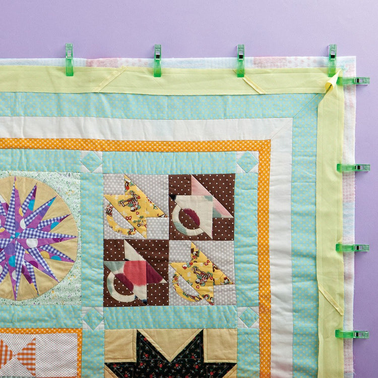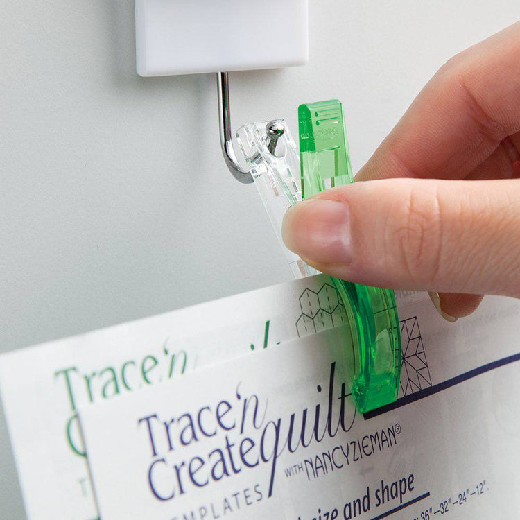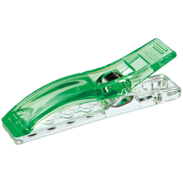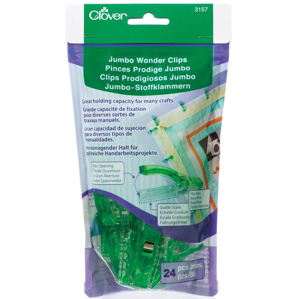 Clover's Jumbo Wonder Clips are a fun alternative to pins, especially when working with vinyl, piles, and heavyweight fabrics! These miniature fabric clips hold your fabric layers together while you sew, instead of using pins that are sharp and can pin your fingers. Since they cover a wider area, you can use them with thick or multiple layers. The clear, flat bottom sits smoothly on a tabletop or sewing machine and has seam allowances for 1/4", 1/2", 3/4", and 1".