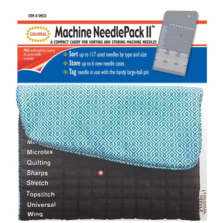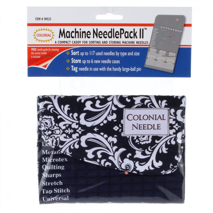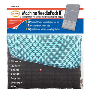 Store all your needles in one place with the Machine Needle Pack II. This caddy can hold up to 117 needles by type and size, store up to six needle packs, and it also includes a tag needle with a large-ball pin, so you do not forget which needle you are using. Keep ballpoint, denim, embroidery, leather, metallic, microtex, quilting, sharps, stretch, tap stitch, universal, wing and multi-point needles in nine different sizes in the Machine Needle Pack II. Pattern may vary.