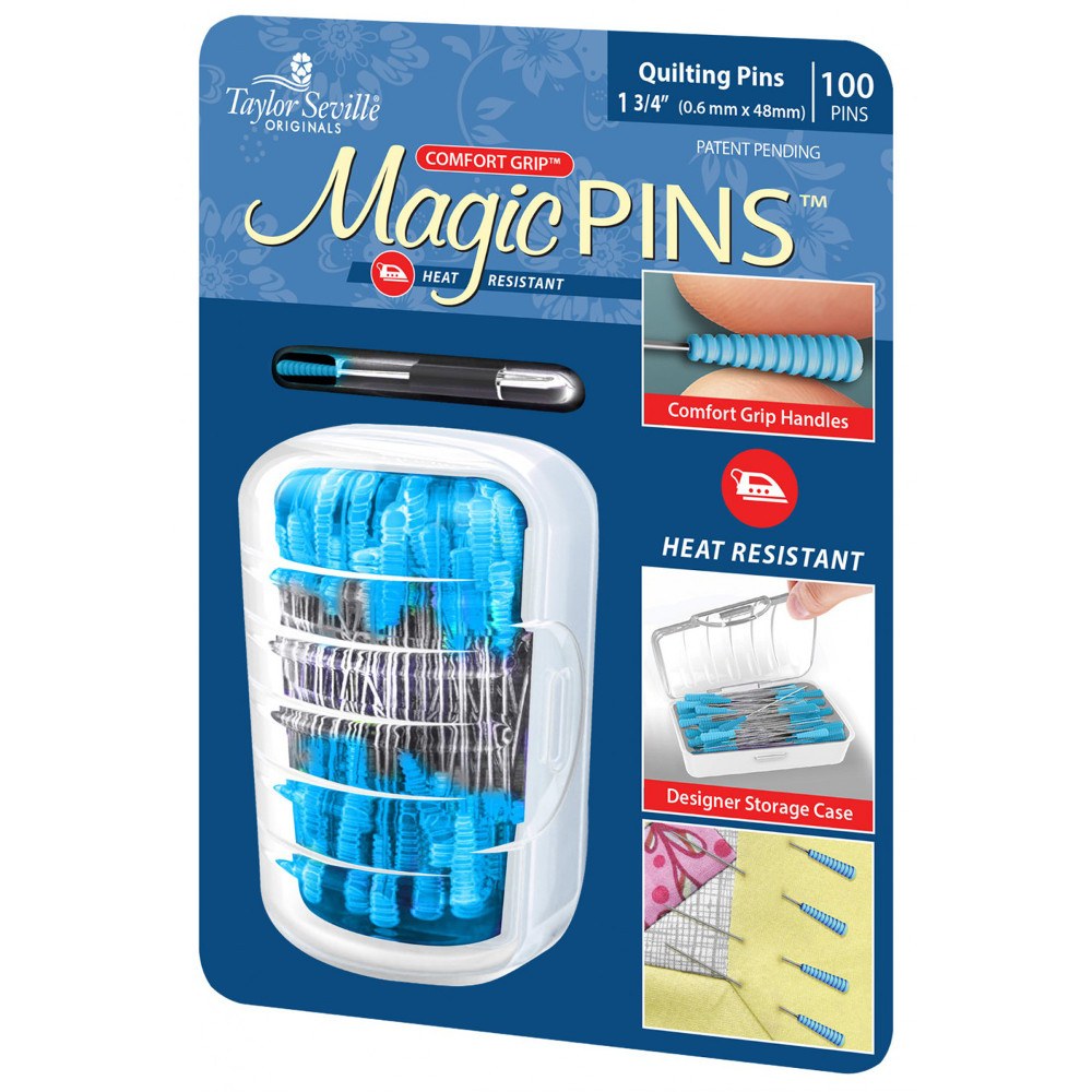 Magic Pins feature blue comfort grip heads that are resistant to heat. Use these 1-3/4-inch quilting pins in your projects and iron directly on them without damaging them. Available in both a 50 and 100 pack with designer case.
