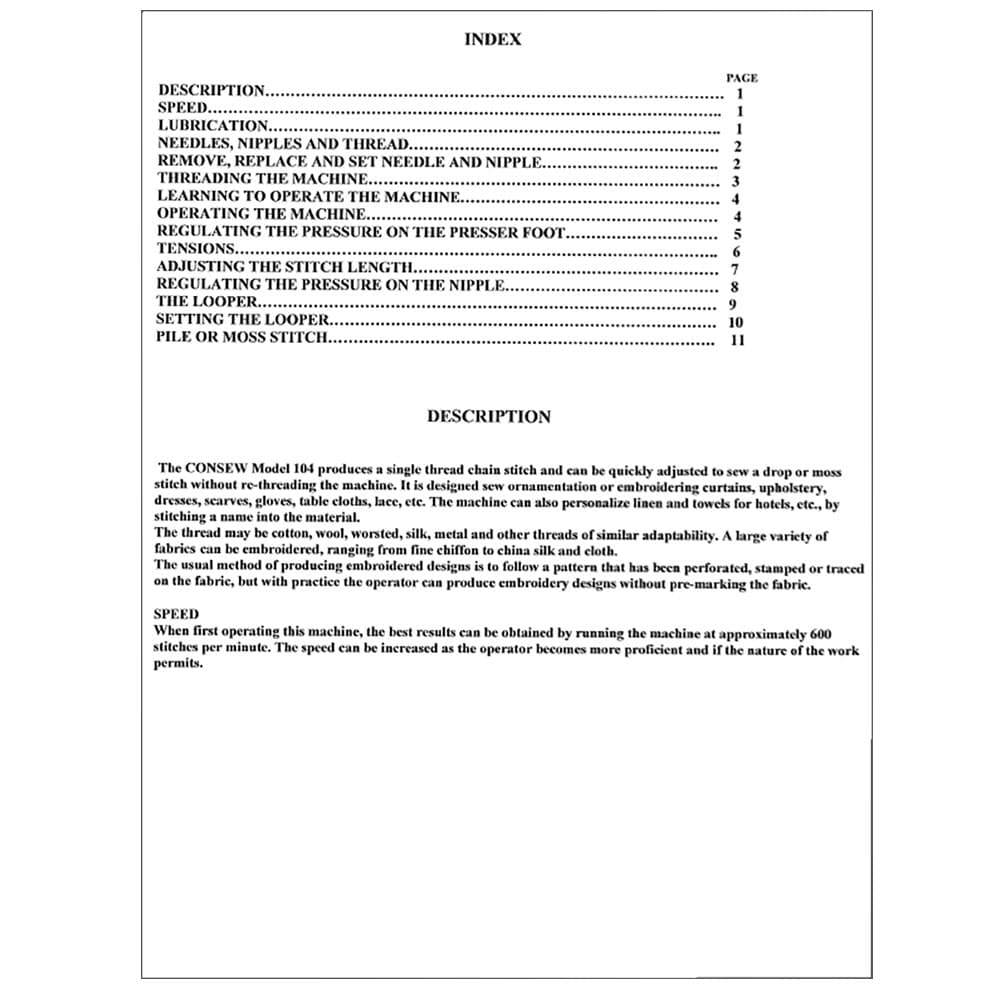 Consew 104 Sewing Machine Instruction Manual (Model 104) - 11 Pages. Lost your sewing machine's manual? We've got you covered! This instruction manual is the ultimate guide to unlock the full potential of your Consew 104. No more confusion or frustration—just clear, concise instructions right at your fingertips. What's inside? Everything you need to know from setting up to mastering your sewing machine and all its features.