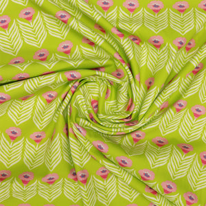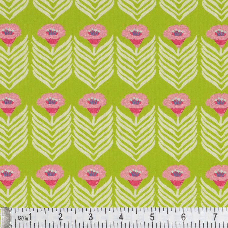 Caminhos de Roselha from the Costeira collection is a vibrant, structured floral print that brings playful elegance to your sewing projects. Neatly aligned rows of stylized pink blooms are framed by crisp white leaf motifs, all set against a lively lime green background that radiates energy and warmth. Translating to “Paths of Roselha,” this design captures the feeling of walking through a cheerful, well-tended coastal garden path. Whether you’re stitching up breezy garments or bold décor, this print adds a charming pop of color and natural symmetry.