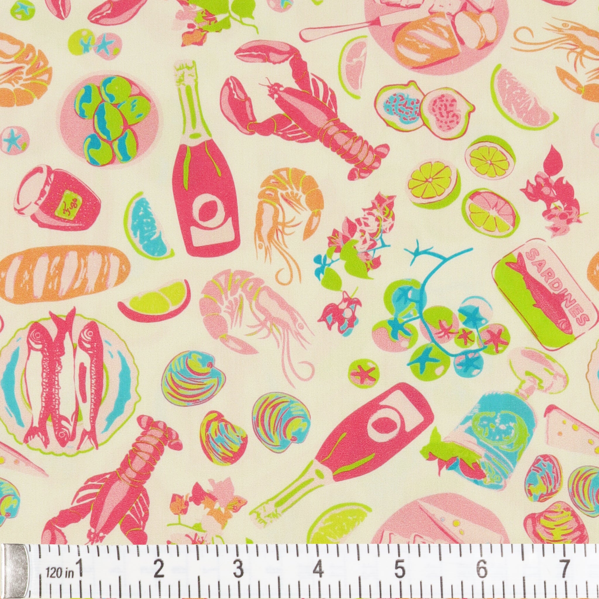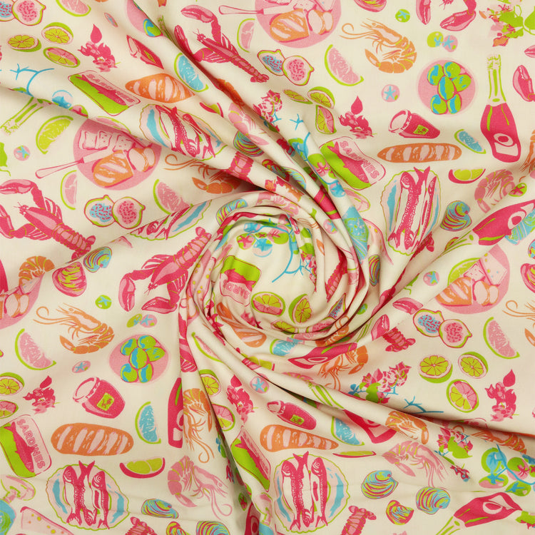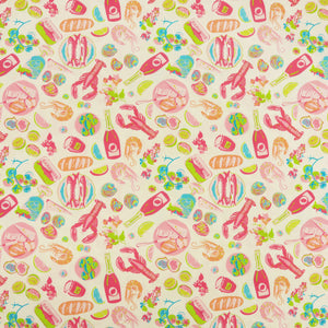 Gosto da Costa Quente from the Costeira collection is a feast for the senses, bursting with vibrant hues and illustrated seaside delicacies. From wine bottles and citrus slices to lobster, shrimp, sardines, and colorful cheeses, this pattern captures the warmth and joy of a sun-soaked coastal meal. Its playful palette of hot pinks, citrus greens, and tropical blues adds energy and charm to any sewing project, from picnic quilts to party accessories. Gosto da Costa Quente translates to “I Like the Warm Coast”, celebrating the lively flavors and festive atmosphere of a summer day by the sea.