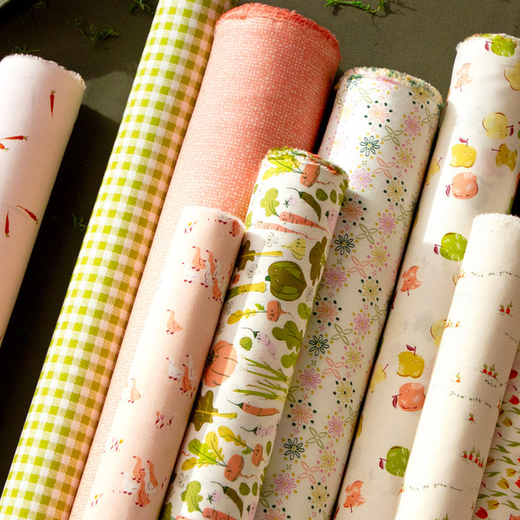 A playful and minimalistic design that adds a cheerful touch to any sewing or quilting project. Set against a soft, pastel pink background, scattered orange carrots with vibrant green tops create a charming, whimsical pattern. The carrots are illustrated with a hand-drawn quality, offering a casual yet endearing aesthetic that feels both modern and nostalgic. Its subtle color palette and simple design make it easy to pair with other prints or solids, providing a delightful accent without overwhelming your creation.