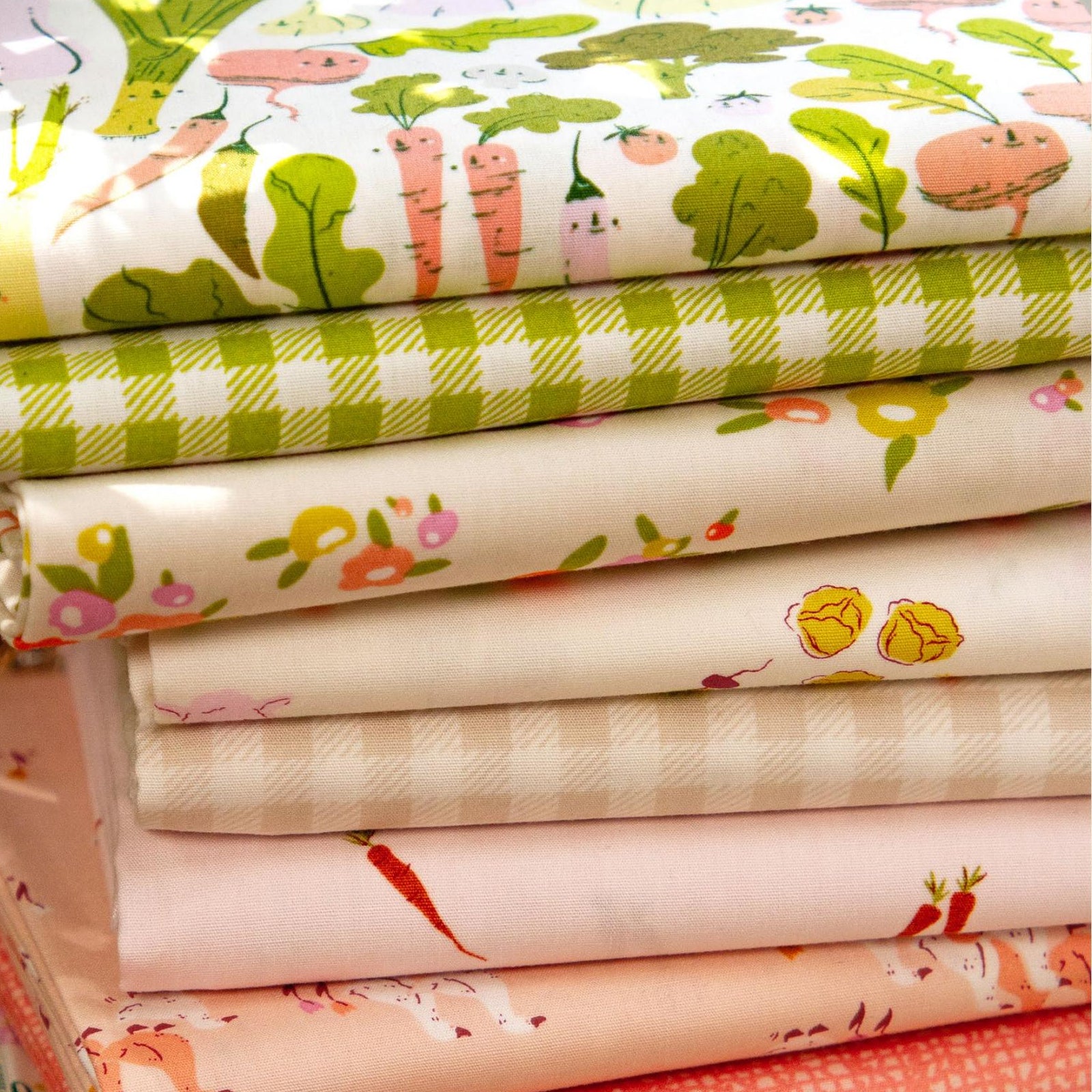 A delightful celebration of fresh, farm-to-table goodness featuring a lively array of illustrated vegetables with playful, expressive faces. Each veggie is uniquely detailed with charming expressions that bring a whimsical touch to the fabric, making it perfect for projects that evoke a sense of fun and joy. This design bursts with personality and charm, from bright orange carrots and cheerful tomatoes to pastel pink radishes and plump green cabbages. The vibrant greens, yellows, and soft pinks of the leafy greens and root vegetables create a cheerful palette that is both fresh and modern.