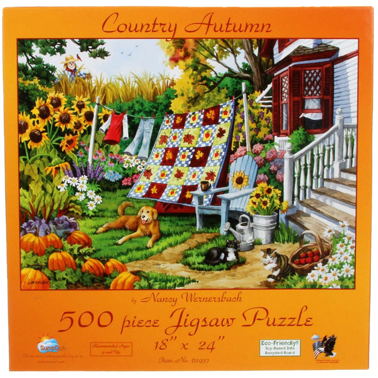 The Country Autumn 500pc puzzle was designed by Nancy Wernersbach. The jigsaw puzzle is eco-friendly and made of soy-based inks. The large pieces make for easy grip, and the interlocking pieces feature durability. The finished puzzle measures 18" by 24". Made in the USA.