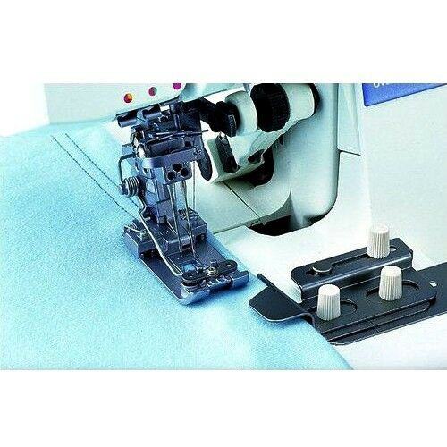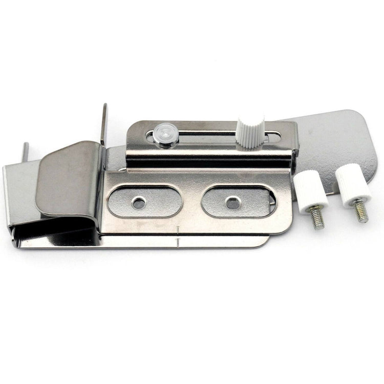 This guide is for setting the folded width of the fabric and the stitching position for coverstitching. This guide can set the folded width of the material and align the edge of the material from the backside, where it is difficult to see the coverstitching. First, fold the fabric to the width that is to be sewn. Then adjust the guide according to the width of the fold. This guide is perfect for finishing pant and sleeve hems of clothes.