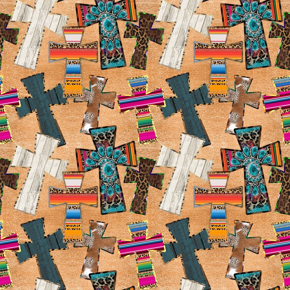 The Cowboy Crosses Fabric is printed by Sew Creative Fabrics. Digitally Printed on 100% cotton and measures 43-45" wide. Sew Creative Fabrics prints are only available through Sewing Parts Online, not sold in stores or anywhere else online. * Proudly Manufactured in Dickson, Tennessee USA! *