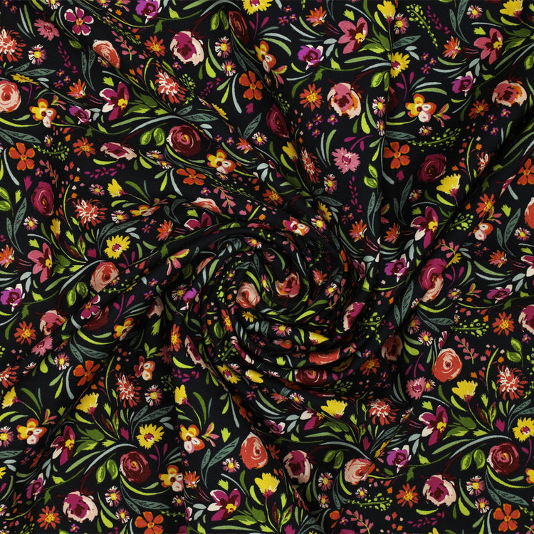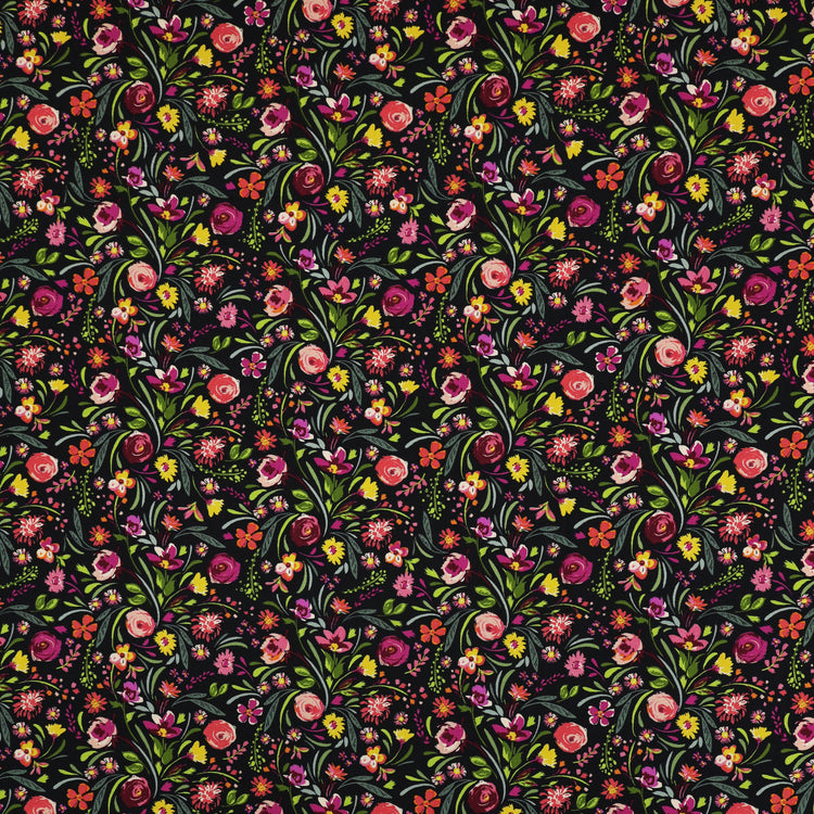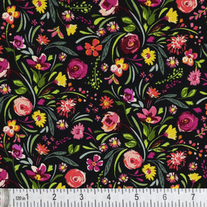 Graceful Blooms brings painterly charm to your sewing table with a cascade of hand-drawn florals in pink, yellow, coral, and green, set against a midnight navy background. The design feels light and energetic, like a meadow swept up in a spring breeze, with petals and stems weaving gracefully in all directions. This print is ideal for everything from romantic quilt borders and floral-focused blocks to apparel pieces like flowy skirts or lightweight tops. If you're drawn to whimsical, garden-inspired prints with a fine art touch, Graceful Blooms will quickly become a favorite in your stash.