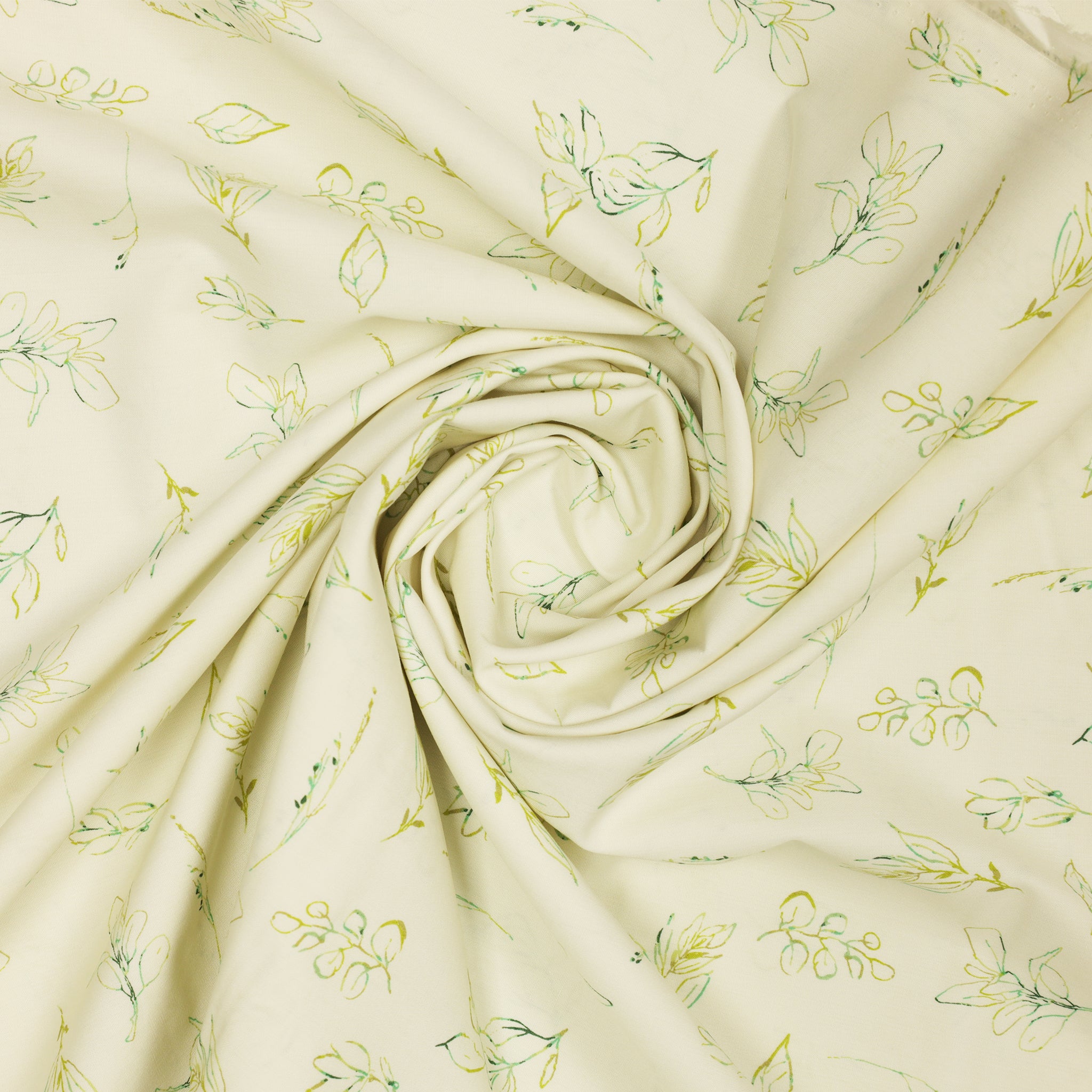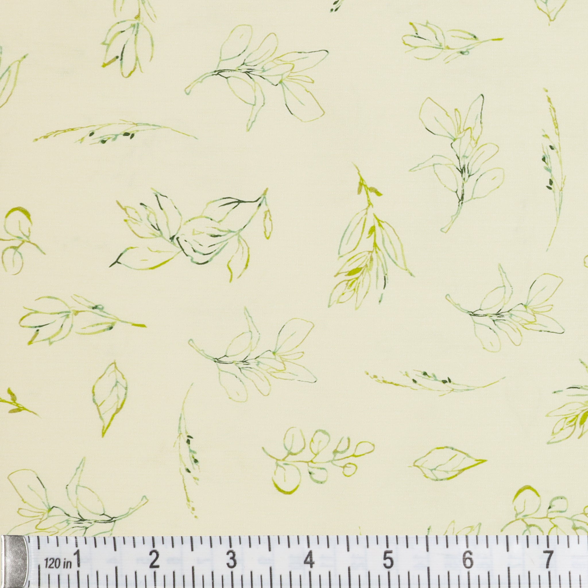 Delicate and airy, Sprinkled Sprigs scatters hand-drawn stems, buds, and leaves across a warm ivory ground like a pressed botanical collection brought to life. The loose watercolor-style linework in shades of olive and turquoise lends the print a natural lightness, while the spacious layout keeps it from feeling crowded. It's an excellent choice for projects that need subtle detail, whether you're piecing a quilt, sewing soft accessories, or crafting something with a light, romantic feel. This print breathes freshness into any fabric mix.