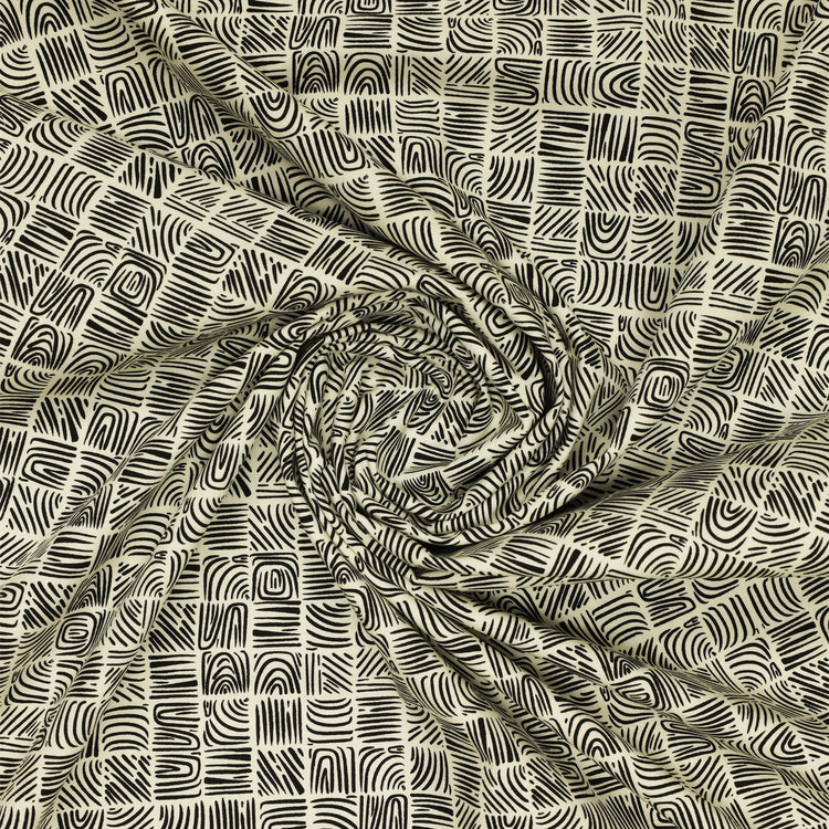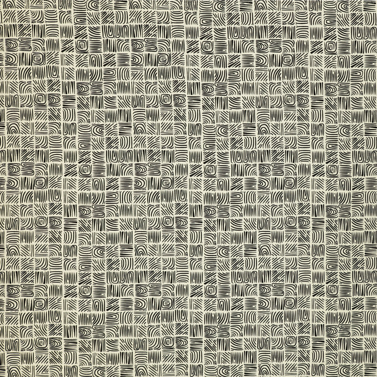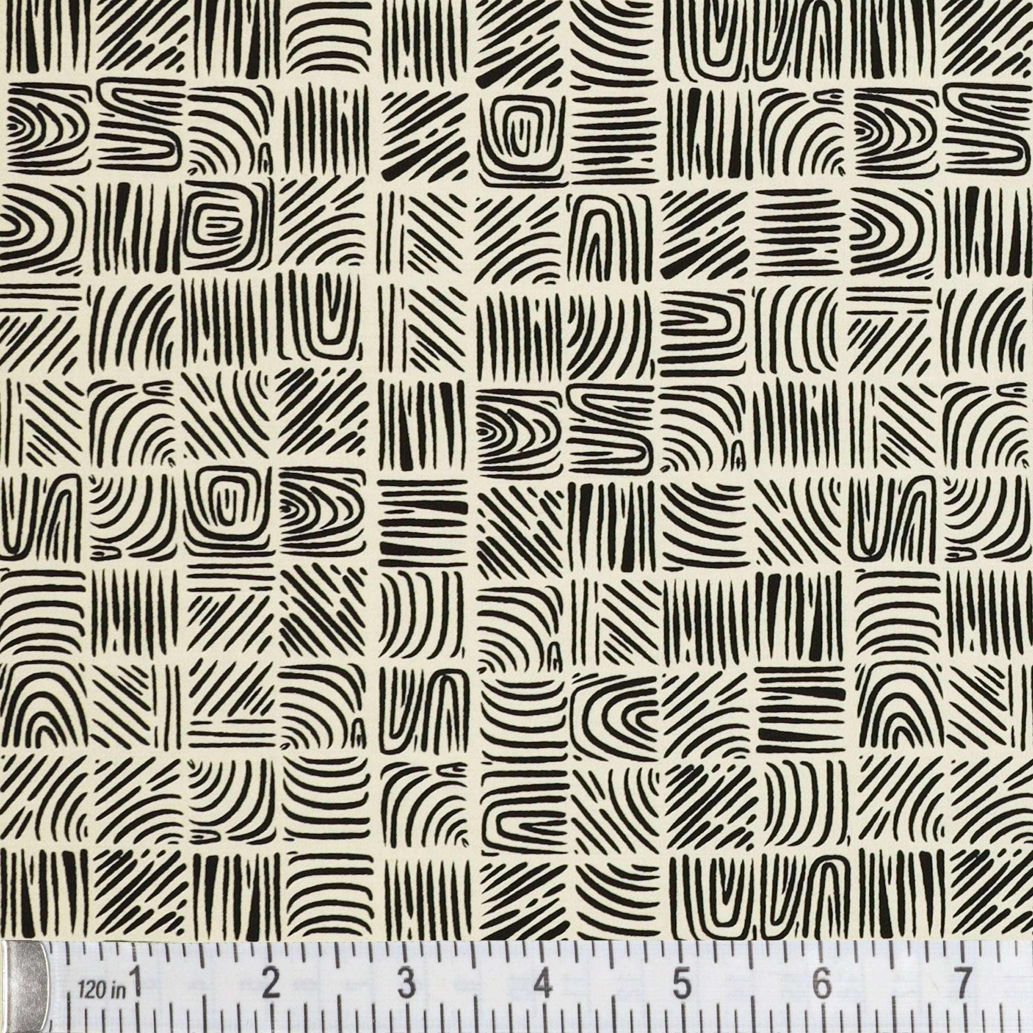 Full of hand-crafted personality, Timber Echoes mimics the look of woodgrain, etchings, or carved block prints with its black-on-cream grid of irregular squares. Each block is filled with curved and linear marks that suggest movement, texture, and depth, giving this geometric print a distinctly organic vibe. It's the kind of fabric that adds sophistication to a low-volume palette or contrast in a high-impact design. Whether you're building a modern quilt or adding texture to garments and bags, Timber Echoes is a striking blender with an artisanal twist.