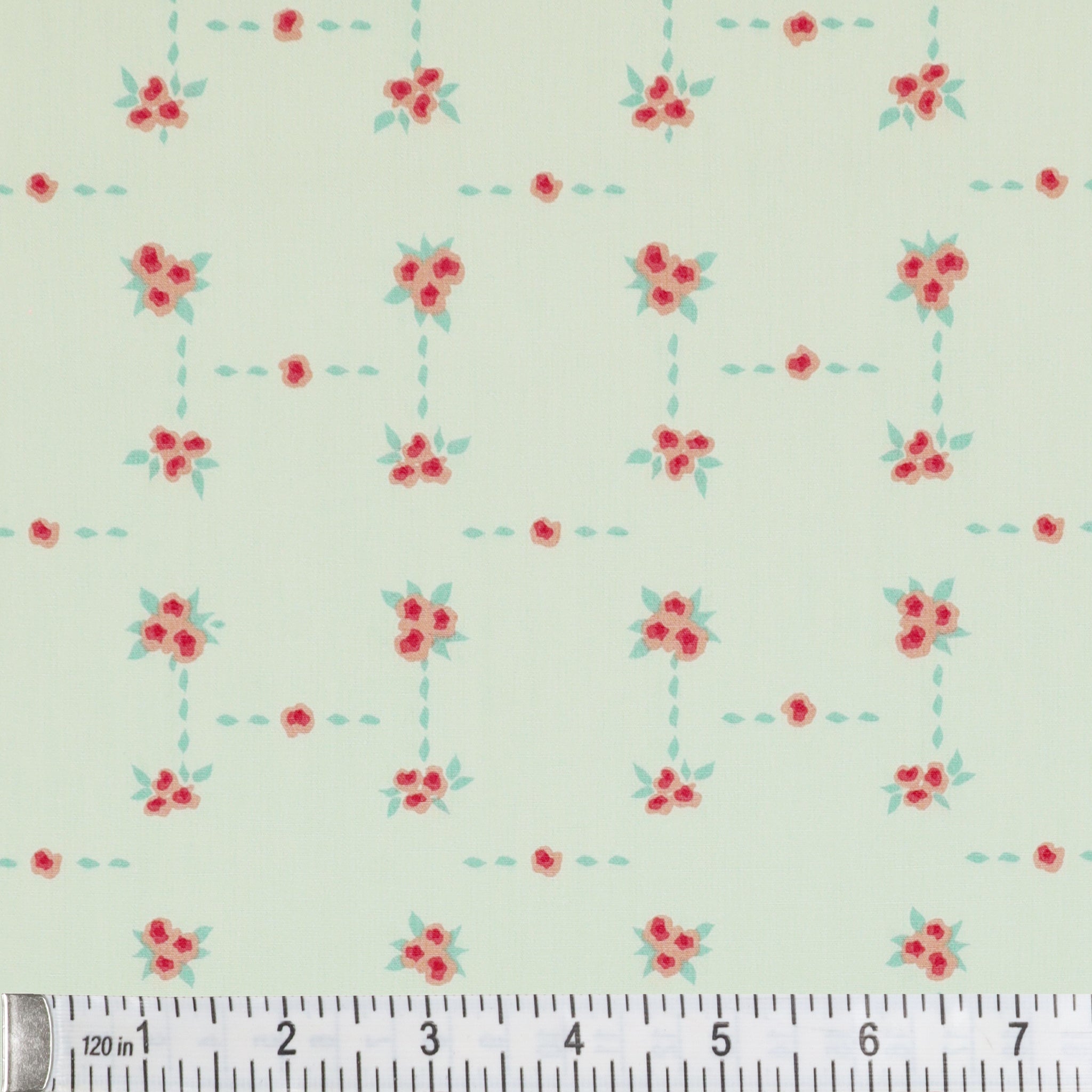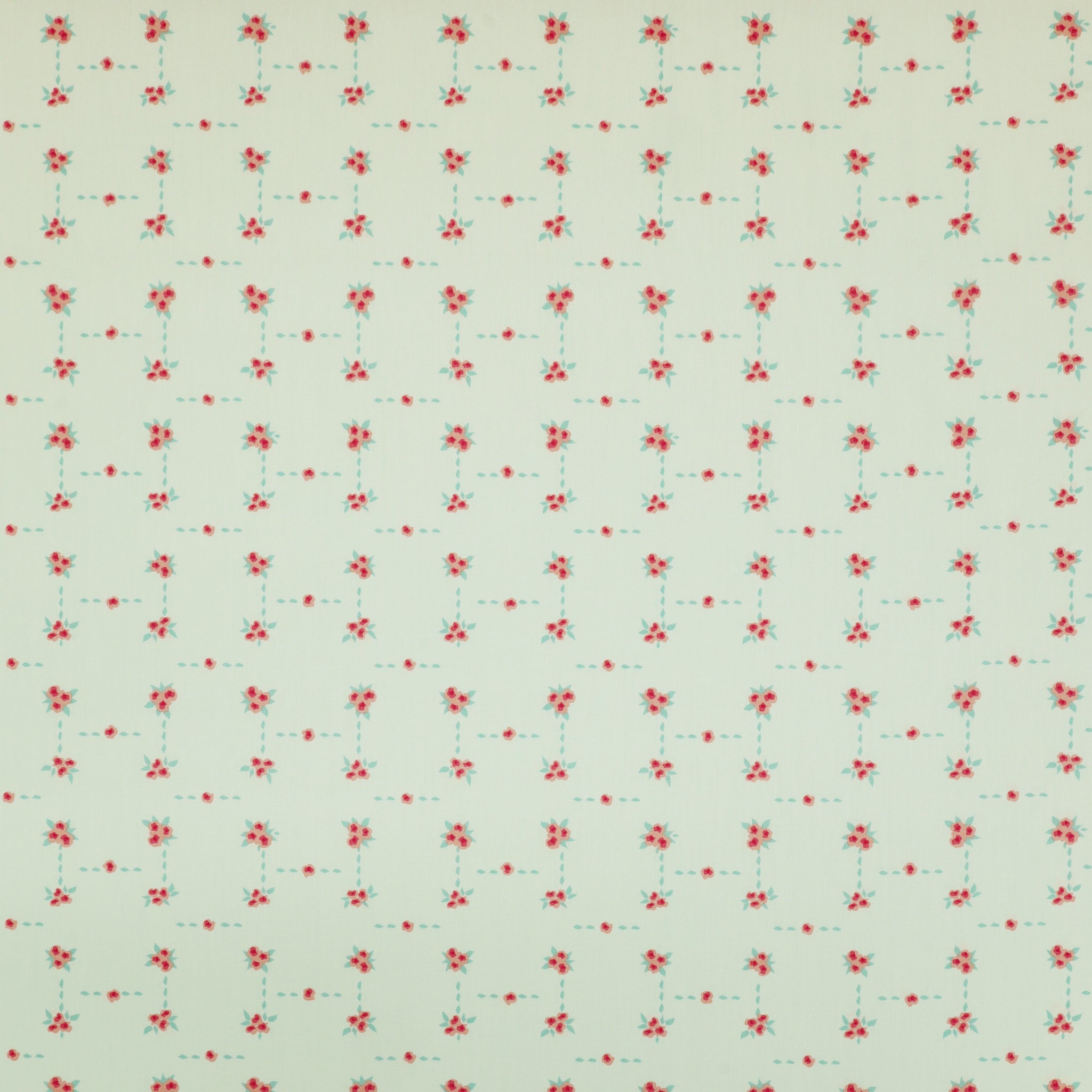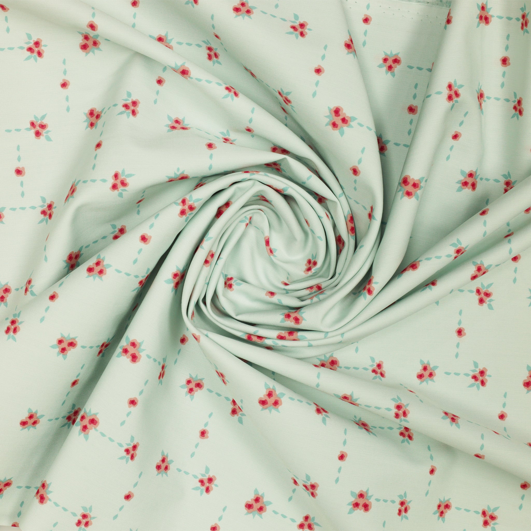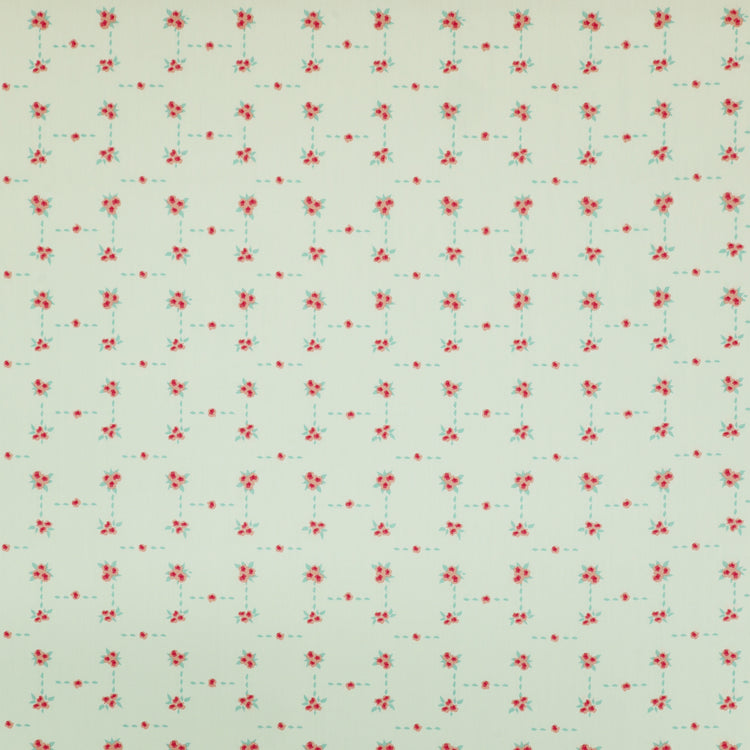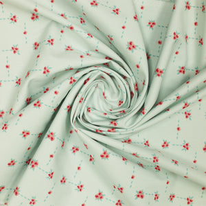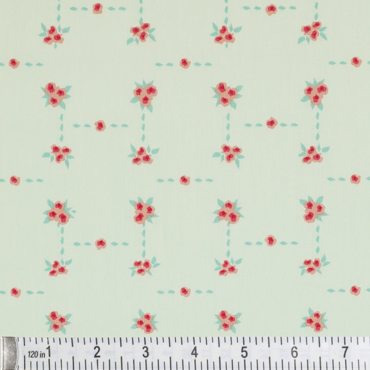 Blossom Road is a charming floral lattice print that brings a cheerful, vintage flair to any project. Clusters of petite pink flowers are arranged in a delicate grid, connected by dotted aqua trails on a powder blue background. The structured yet whimsical design feels like a stitched garden path, perfect for adding a playful touch to quilts, aprons, and sweet little sewing projects. Its soft hues and tidy layout make Blossom Road an ideal blender or stand-alone print for romantic, cottagecore-inspired creations.