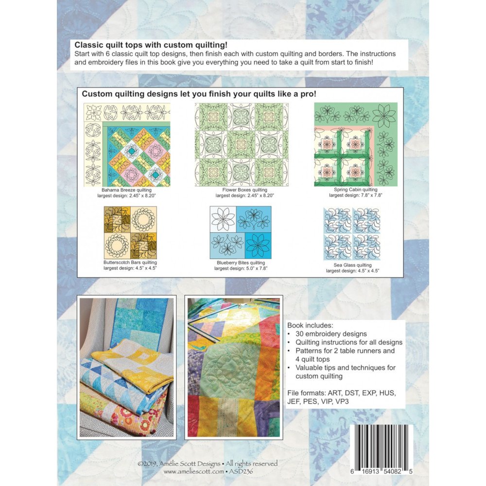 Finish quilts like a professional with Amelie Scott's Custom Quilting on your Embroidery Machine Book and Embroidery CD. The book includes six patterns (four quilt tops and two table runners). The include embroidery cd contains 30 designs for quilting in the hoop. Stitch fields vary in range from 5.5in square to 7.8in square. Compatible file formats ART, DST, EXP, HUS, JEF, PES, VIP, VP3. Enjoy valuable tips and techniques, from Amelie Scott, for creating custom quilts.