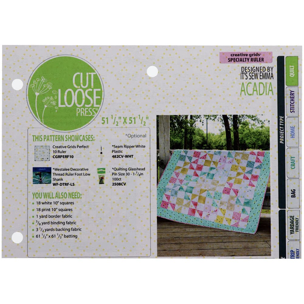 Designed by It's Sew Emma for Cut Loose Press, the Acadia Quilt Pattern features squares and half-square triangles. Use Creative Grids Perfect 10 Ruler to get perfect squares and triangles. With a difficulty level of beginner, anyone can make this Acadia Pattern. The step-by-step instructions and recommended materials that are included with the Acadia Pattern will have you finishing this quilt in no time at all. The finished quilt measures 51.5" x 51.5".
