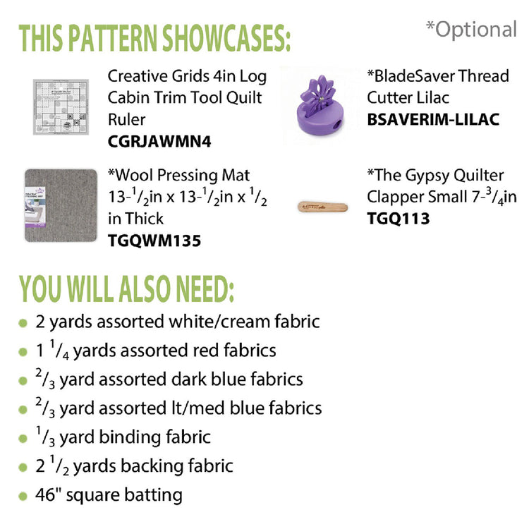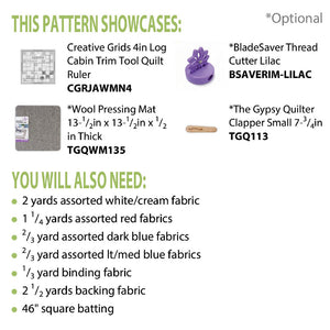 Lisa DeBord's American Sweetheart Mini Quilt Pattern is an intermediate skill level pattern that is strip-friendly. To recreate this design, you will need red, white, and blue fabrics strips, as well as Creative Grids 4in Log Cabin Trim Tool (not included). Once finished, the American Sweetheart Pattern measures approximately 40" square, making it the ideal size for a wall hanging or baby quilt.