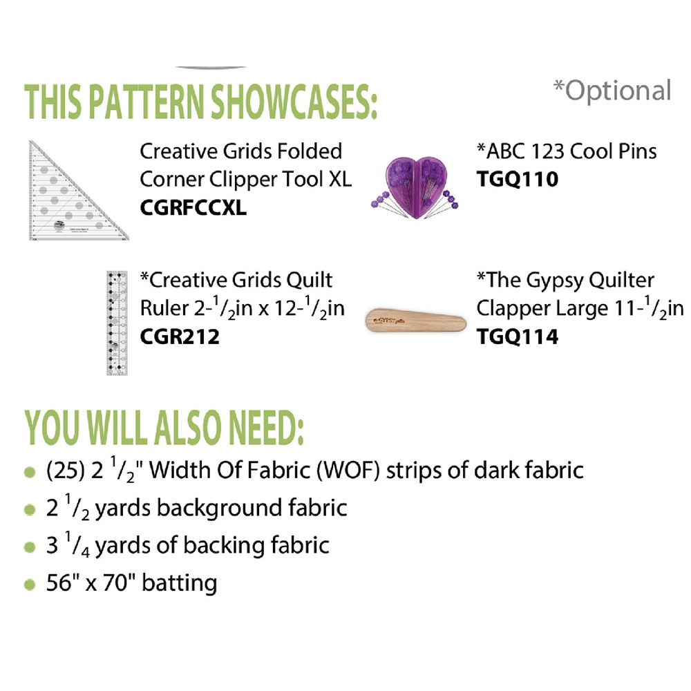 Recreate Susan Nelson's Bauble Chain Quilt Pattern from Cut Loose Press with different multicolored strips of fabric. This beginners level design requires Creative Grids XL Folded Corner Clipper Tool (not included). After your strips of fabric are sewn together, this quilt will come together very quickly (less than a day), and best of all, there is no wasted fabric. Once complete, the Bauble Chain Quilt Pattern finishes to 50" by 64". Included with the design are detailed instructions and a suggested materials list.