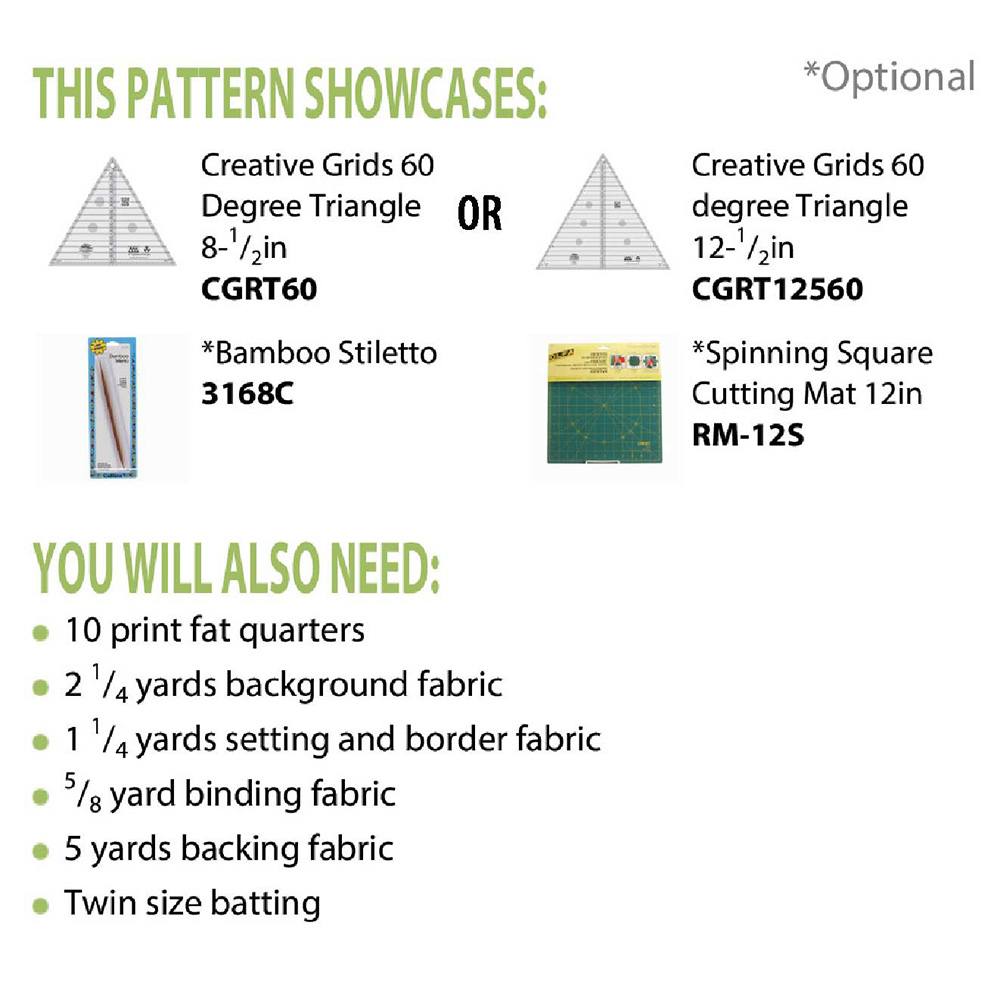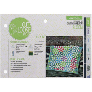 Are you ready to bloom? The Cut Loose Press Bloom Quilt Pattern designed by Christine Van Buskirk is a great spring-themed pattern for the confident beginner. This pattern includes all the instructions you need to make the quilt shown above. This design is comprised mostly of hexagonal blocks made from half triangles. This project requires the Creative Grids 8-1/2in 60 Degree Triangle or 12-1/2in 60 Degree Triangle ruler (not included).